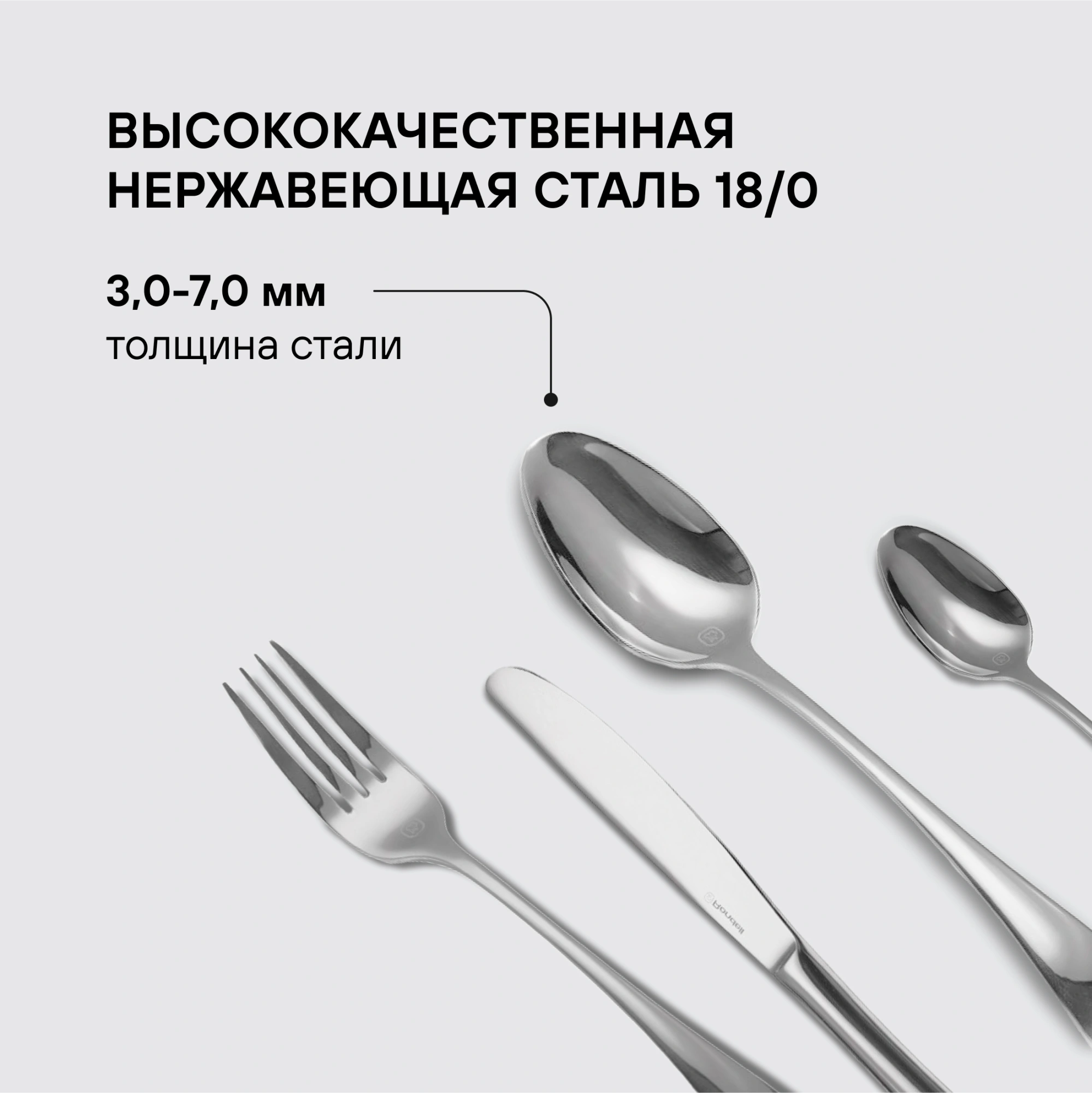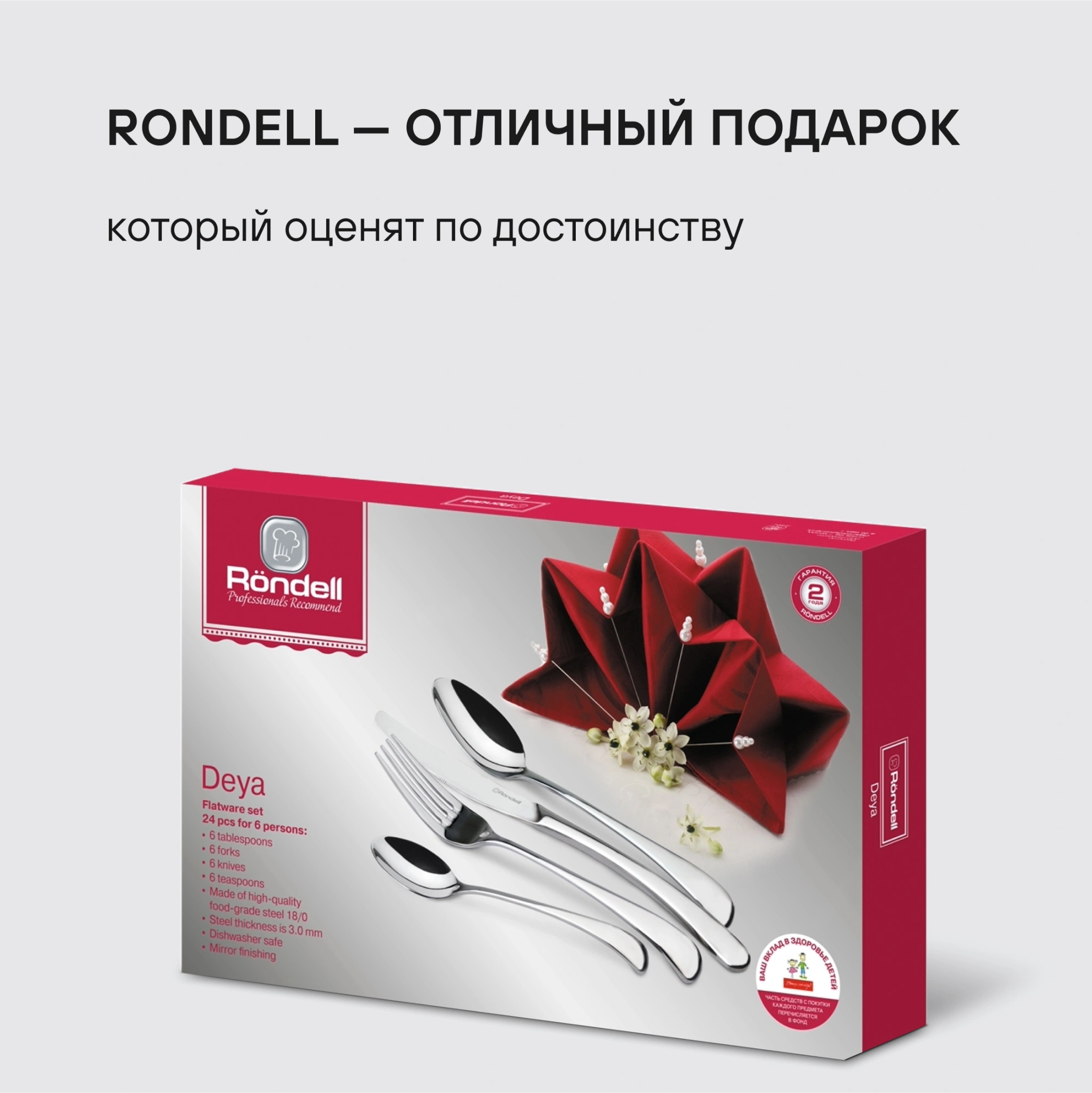 Любите принимать гостей? Тогда коллекция столовых приборов Deya от Rondell, рассчитанная на 6 персон, вам, безусловно пригодится! Вилки, ножи, столовые и чайные ложки набора изготовлены из высококачественной нержавеющей стали, дополненной изумительной зеркальной полировкой.