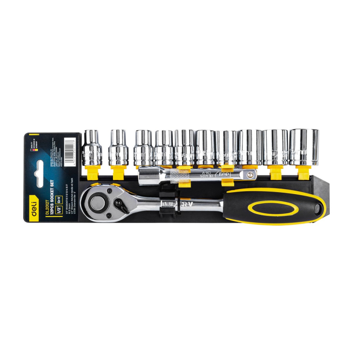 Набор торцевых головок с трещоткой 12 предметов Deli DL2012T 1/2" (10 торцевых головок (10,11,12,13,14,15,17,19,21,24 мм), удлинитель, трещотка 45 зубьев, сталь 50BV30