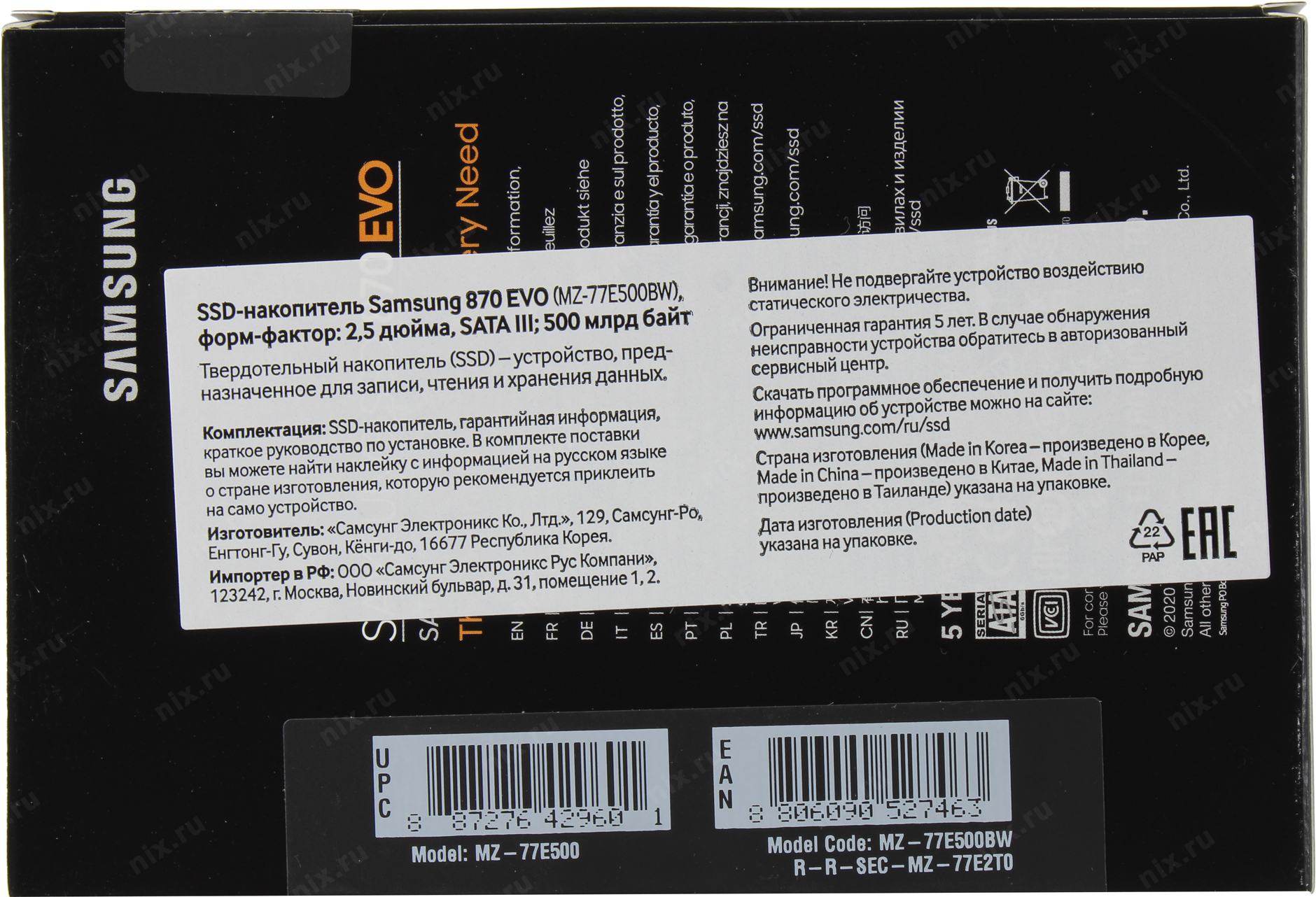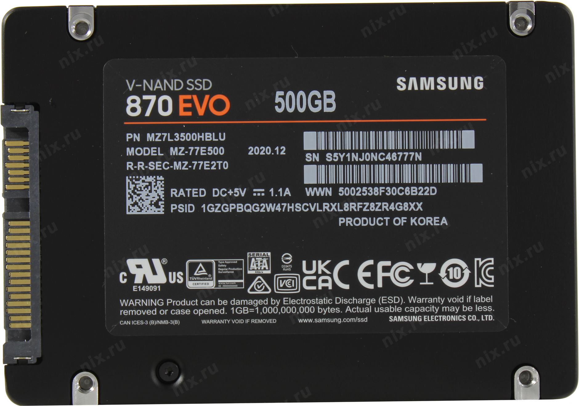 Накопитель SSD 500Gb SATA 6Gb/ s Samsung 870 EVO < MZ-77E500B/ W> (RTL) 2.5" V-NAND 3bit-MLC