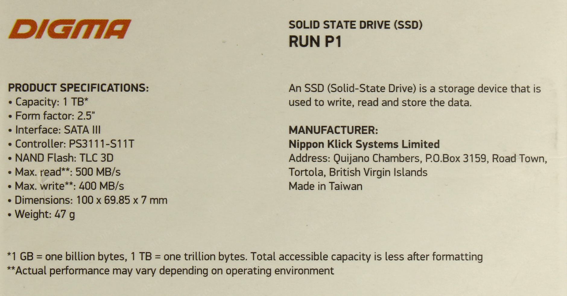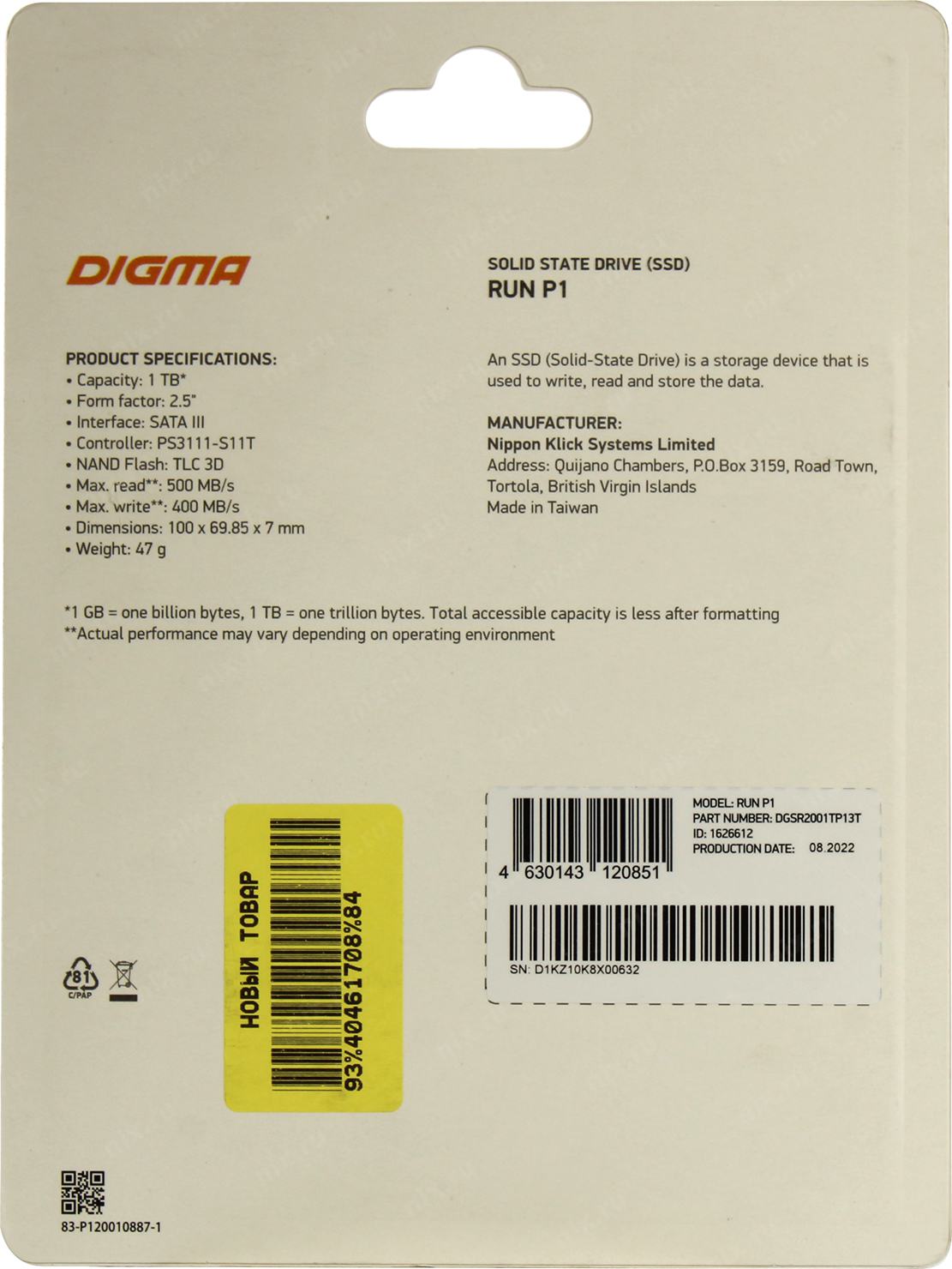 Накопитель SSD Digma SATA-III 1TB DGSR2001TP13T Run P1 2.5"