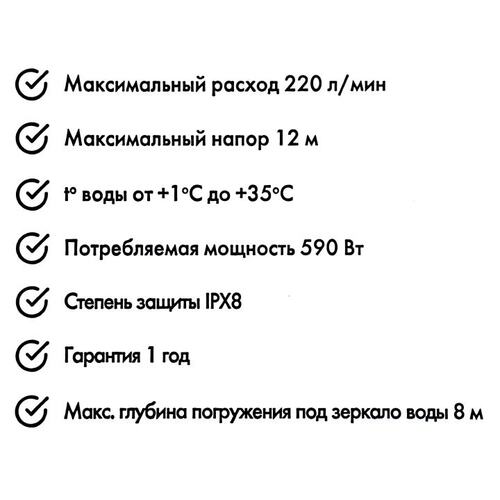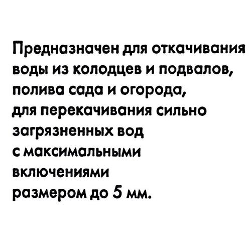 Предназначен для откачивания дождевых и грунтовых вод из затопленных подвальных помещений,  отвода жидкостей из сточных канав. Может использоваться для подачи чистой воды из колодцев или открытых источников воды,  наполнения накопительных емкостей. Оснащен поплавковым выкл. и съемным дном.