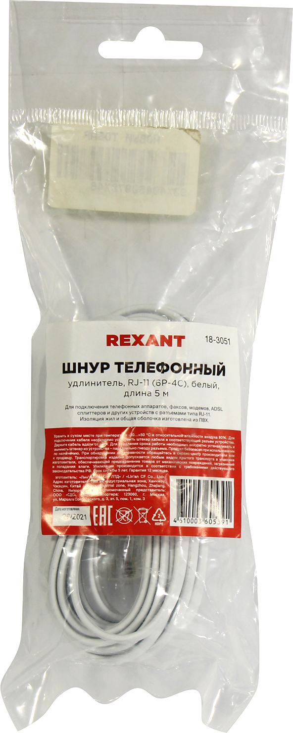 Патч-корды (сетевые, телефонные) Rexant (18-3051) Удлинитель телефонный, плоский, RJ-11 (6P-4C), 5м, белый