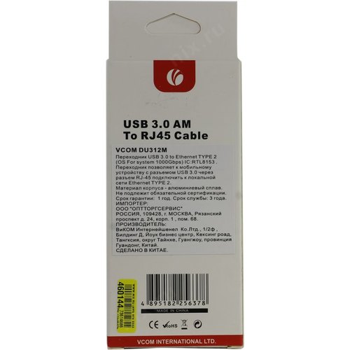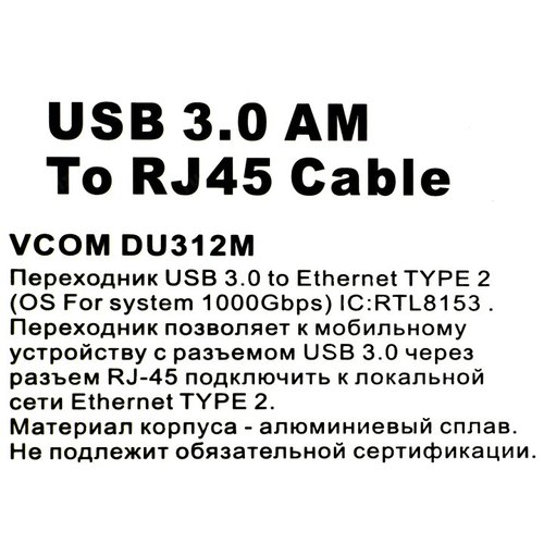 Переходник VCOM DU312M Кабель-переходник USB 3.0 (Am) --> LAN RJ-45 Ethernet 1000 Mbps, Aluminum Shell, VCOM <DU312M>[4895182256378]