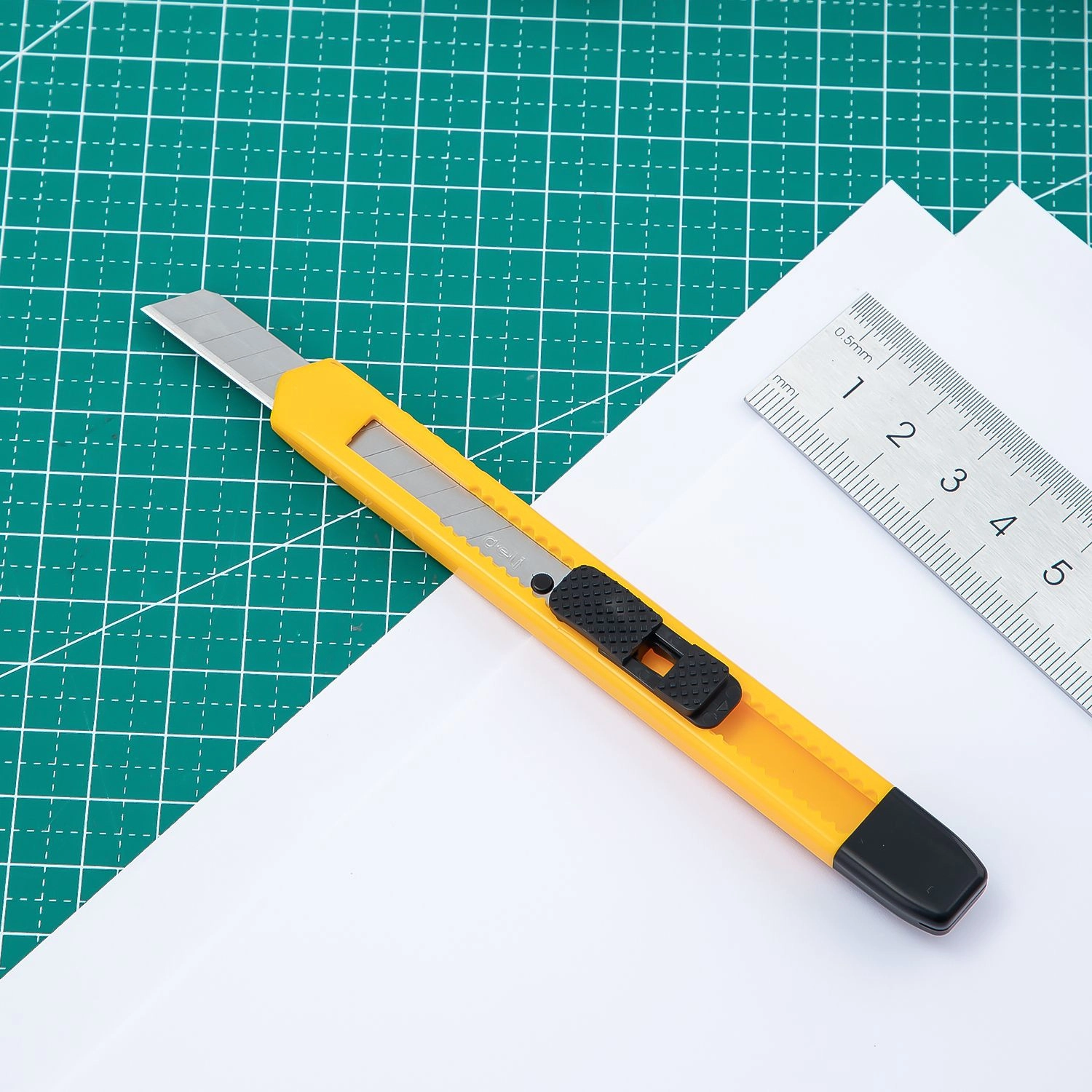 Канцелярский нож с шириной лезвия 9мм, толщина стали 0, 4мм, упаковка - пакет с европодвесом, цвета в ассортименте: красный, синий