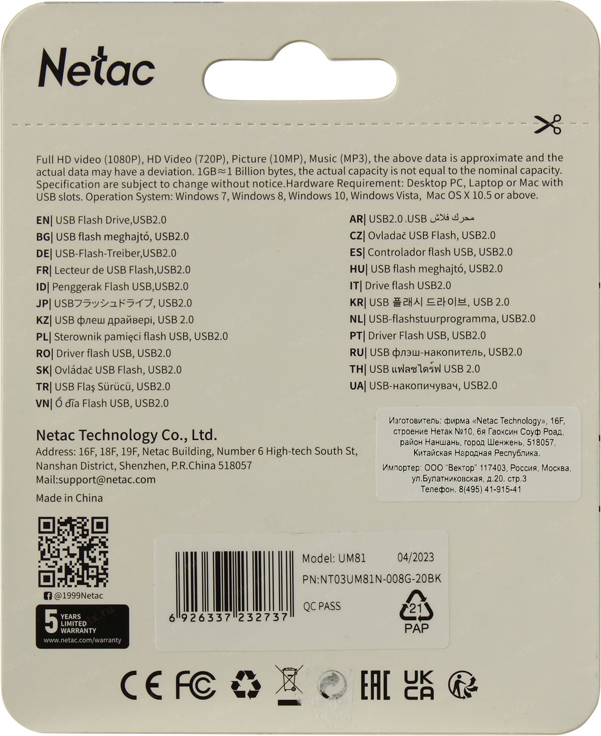 Носитель информации Netac USB Drive 8GB UM81 < NT03UM81N-008G-20BK> , USB2.0, Ultra compact