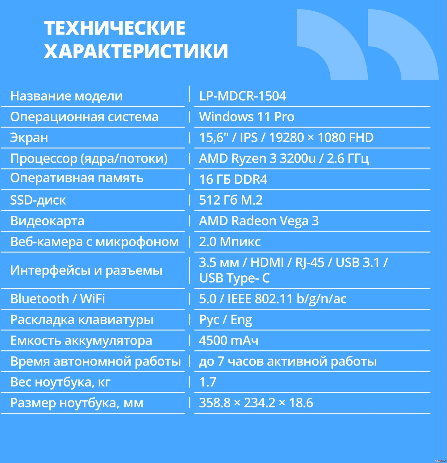 Ноутбук CBR LP-MDCR-1504 15.6" FHD IPS (AMD Ryzen 3 3200U(2.6GHz) /16Gb DDR4 3200MHz / 512Gb SSD PCIe / AMD Radeon RX Vega 3 / RJ45 / Windows 11 Pro /5000 mAh /пластик) [CBR-HNLP15R3-16G512G-WP]