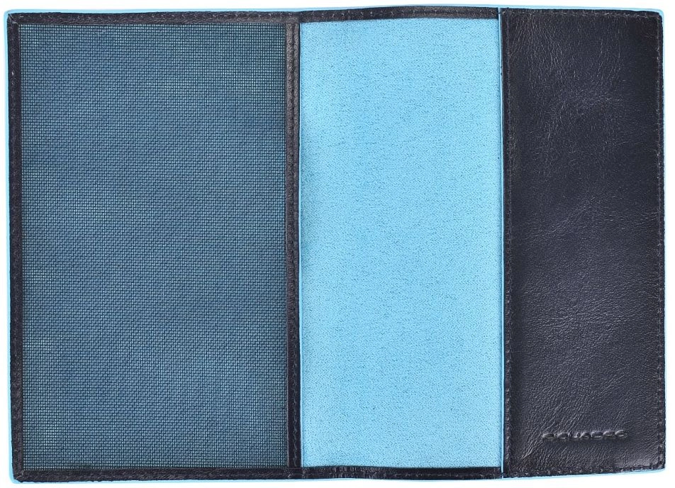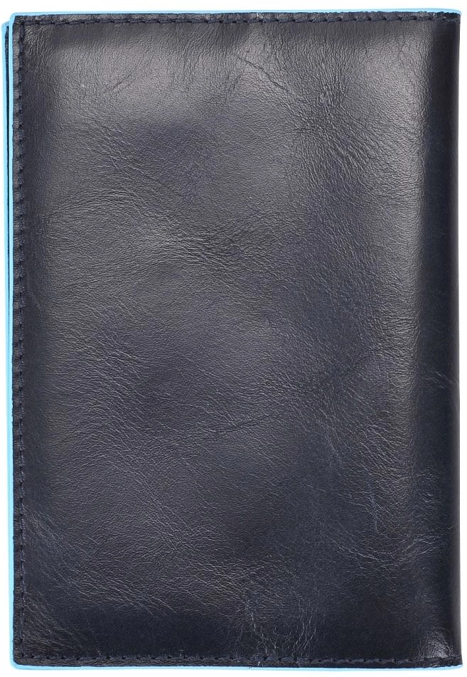 Стильная обложка для паспорта из гладкой телячьей кожи с голубой окантовкой из коллекции Piquadro Blue Square. Упакована в фирменную коробку.