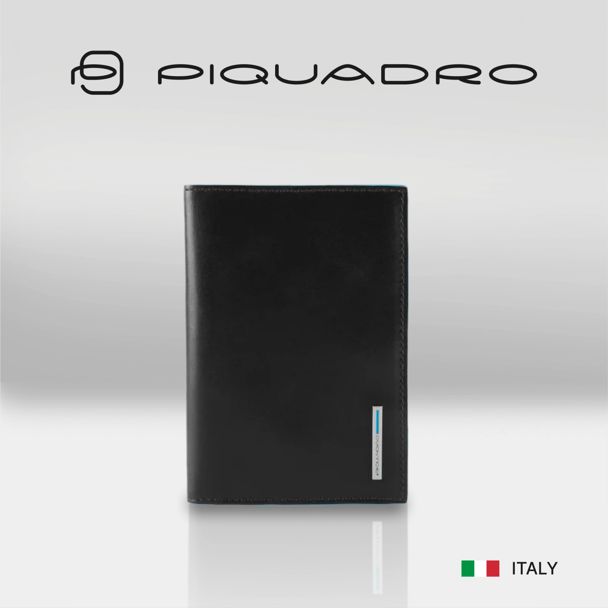 Стильная обложка для паспорта из гладкой телячьей кожи с голубой окантовкой из коллекции Piquadro Blue Square. Упакована в фирменную коробку.