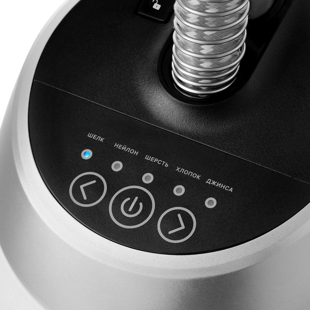 У отпаривателя есть 5 режимов подачи пара для различных типов тканей, которые устанавливаются кнопками «Больше» или «Меньше»: шелк, нейлон, шерсть, хлопок и джинса.