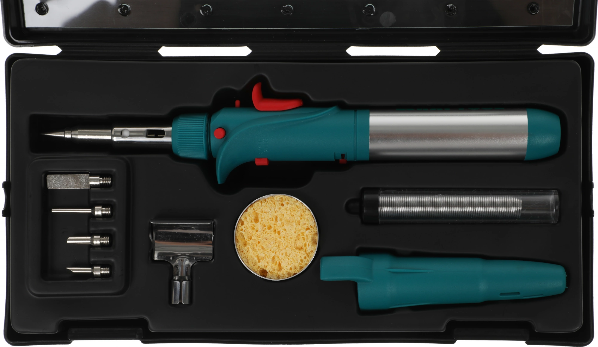 Кейс. Горелка. Насадки - 7 шт. Защитный колпачок. Припой. Губка для чистки жал.