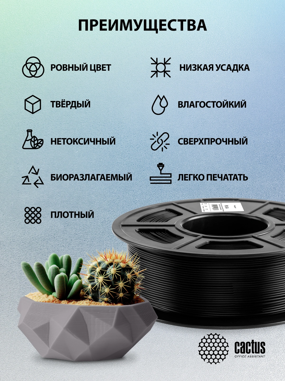 Пластик для принтера 3D Cactus CS-3D-PLA-1KG-BLACK PLA d1.75мм 1кг L326м 1цв.