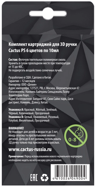 Пластик для ручки 3D Cactus CS-3D-UVPS-B УФ-полимер 6цв.