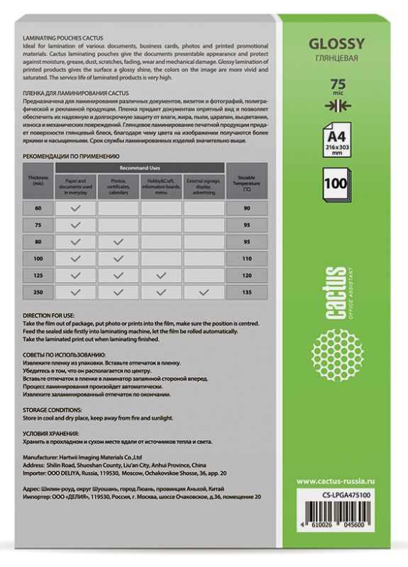 Пленка для ламинирования Cactus 75мкм A4 (100шт) глянцевая 216x303мм CS-LPGA475100