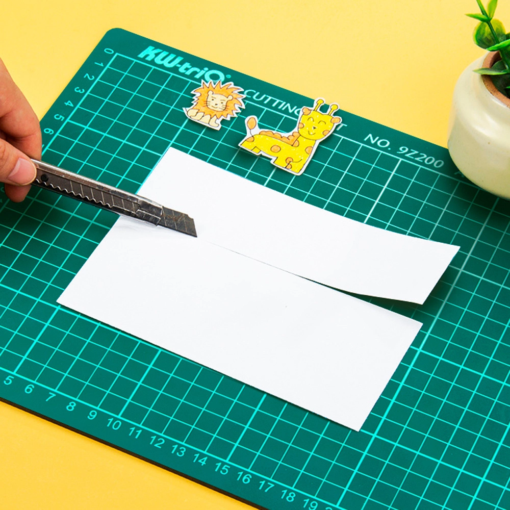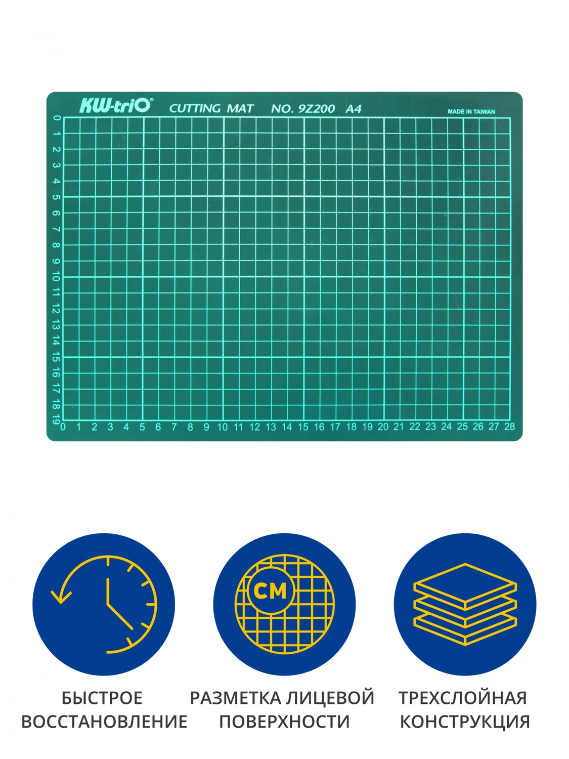 Коврик для резки KW-triO, изготовленный из трехслойного пластика, используется для защиты поверхностей и сохранения остроты режущих кромок лезвий ножей. Имеет разлиновку на лицевой поверхности. Применяется при работе с макетными и циркульными ножами.