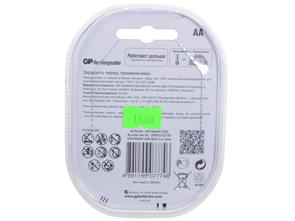 Аккумулятор GP 270AAHC(HP)-2 (1.2V, 2600mAh) NiMH, Size "AA" <уп. 2 шт>