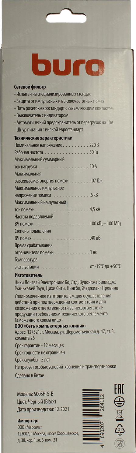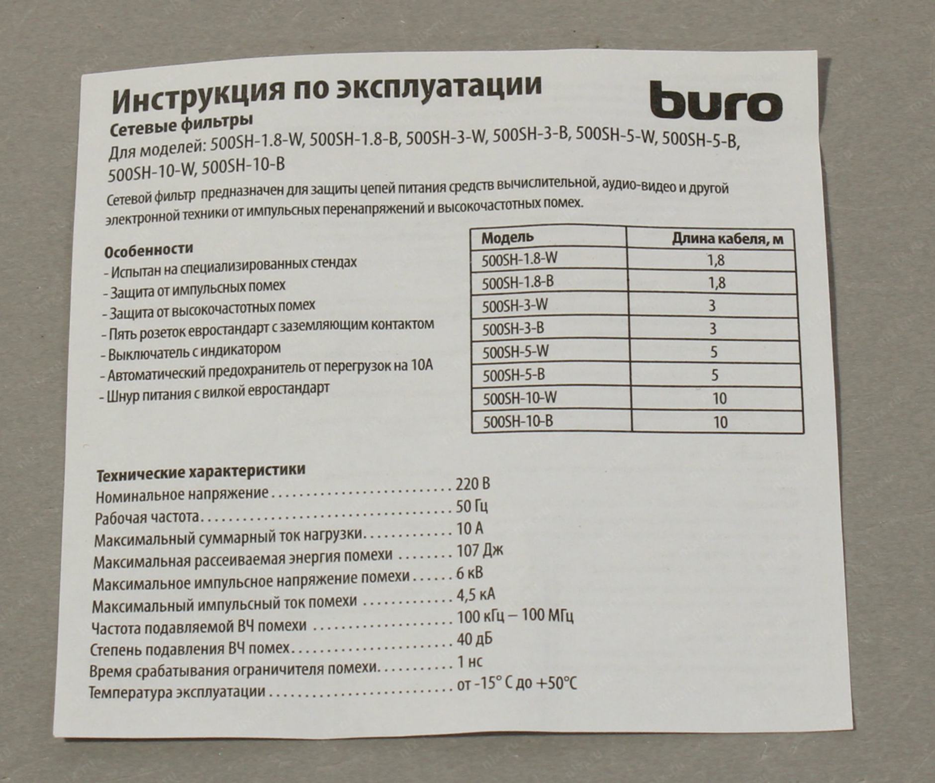Сетевой фильтр Buro 500SH-5-B <5м> (5 розеток)