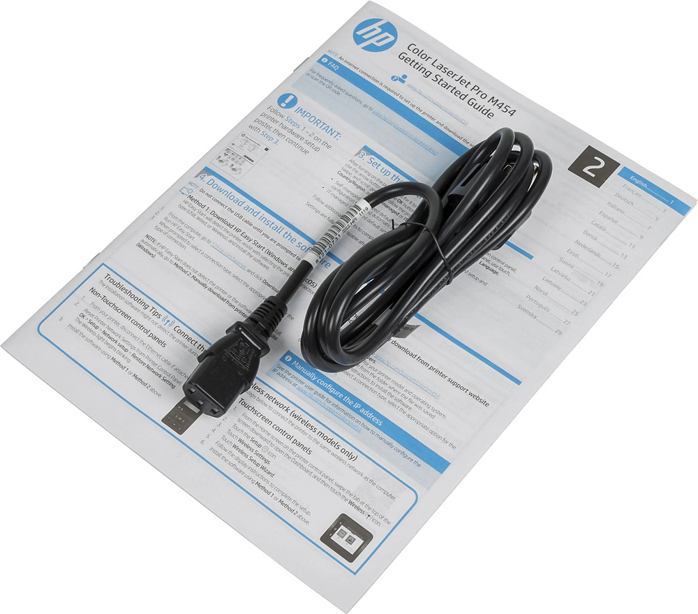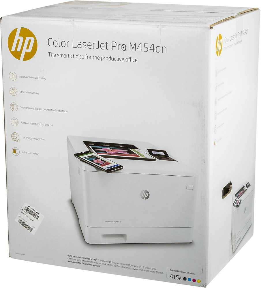 HP Color LaserJet Pro M454dn; 4 предустановленных пробных тонер-картриджа HP LaserJet (черный, голубой, пурпурный, желтый: 1200 страниц) ; документация в комплекте (руководство по началу работы, плакат с инструкциями по установке) ; листовка с нормативными требованиями; кабель питания