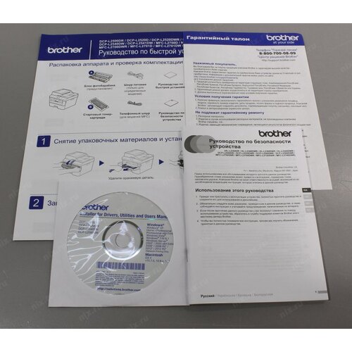Диск с ПО, пробный картридж, кабель питания
