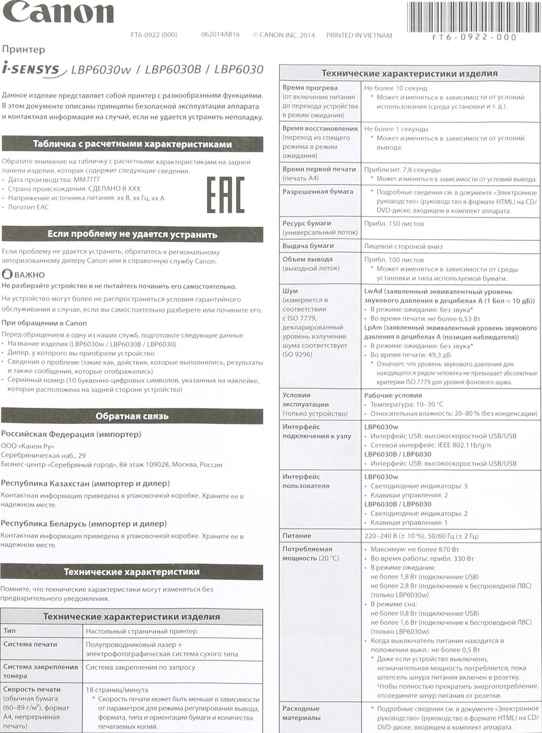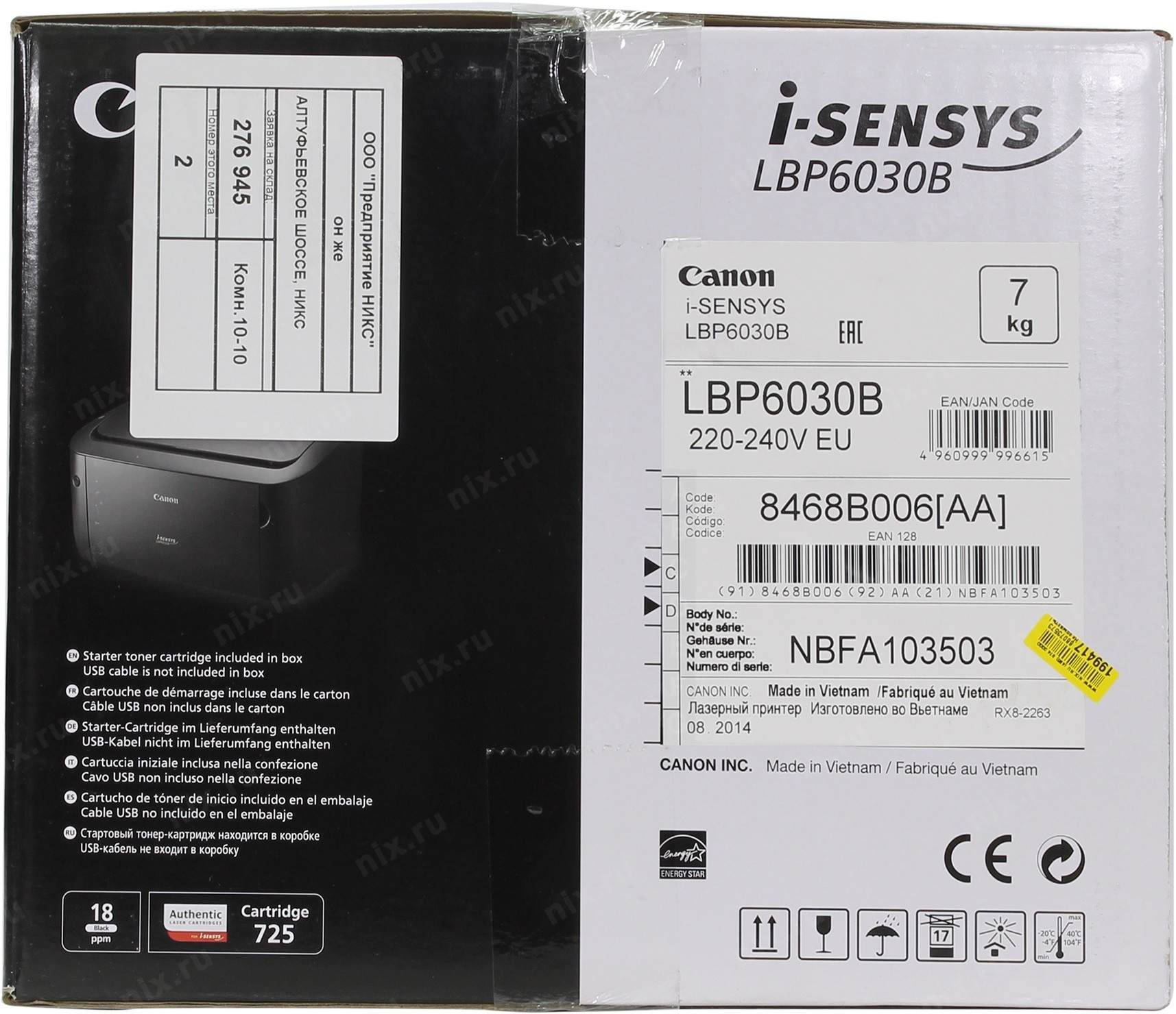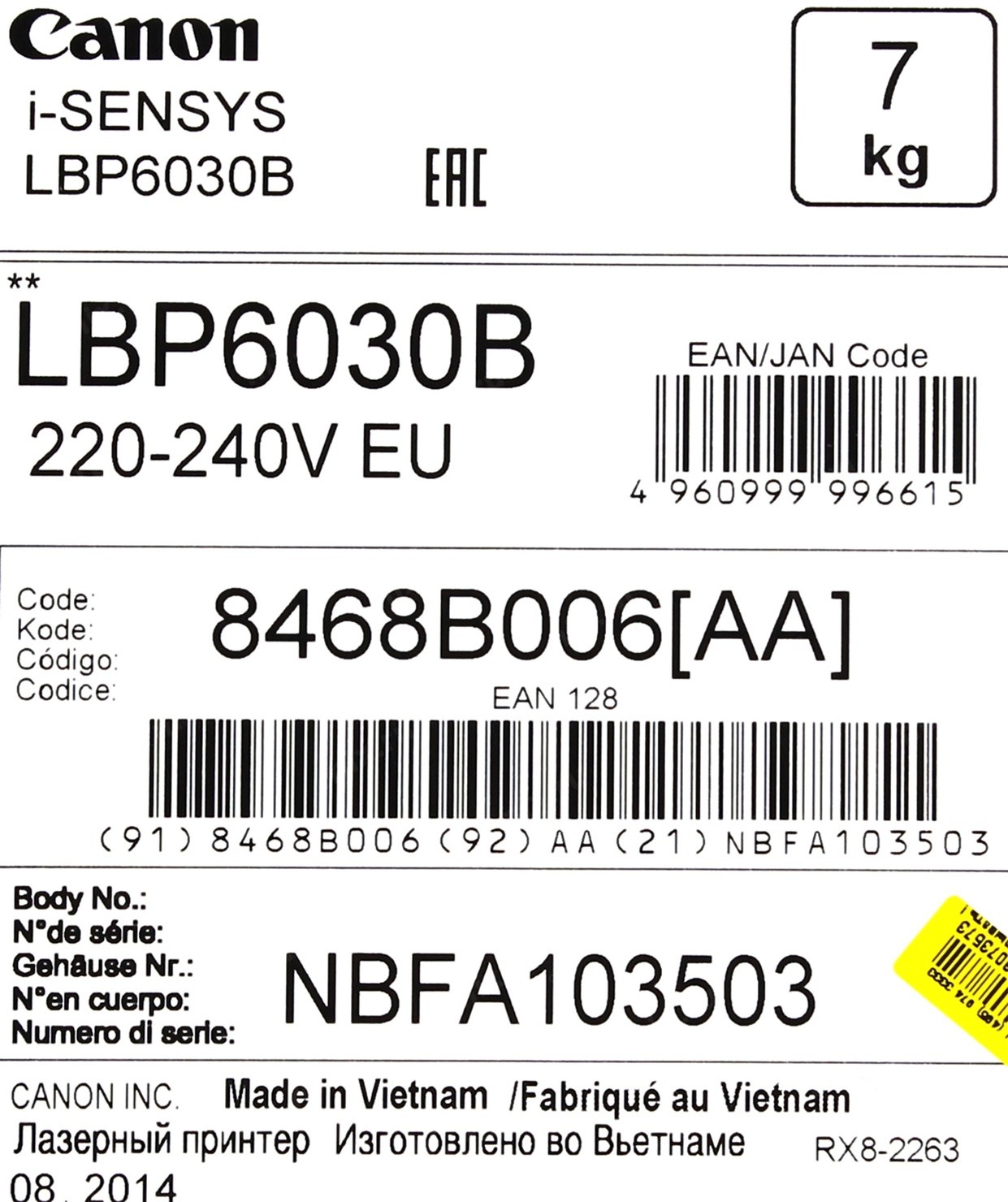 Canon i-Sensys LBP6030B A4, принтер, лазерный, черно-белый, 18стр/мин, 600dpi, 32Мб, USB, 700стр/картридж, (8468B006)(996615)