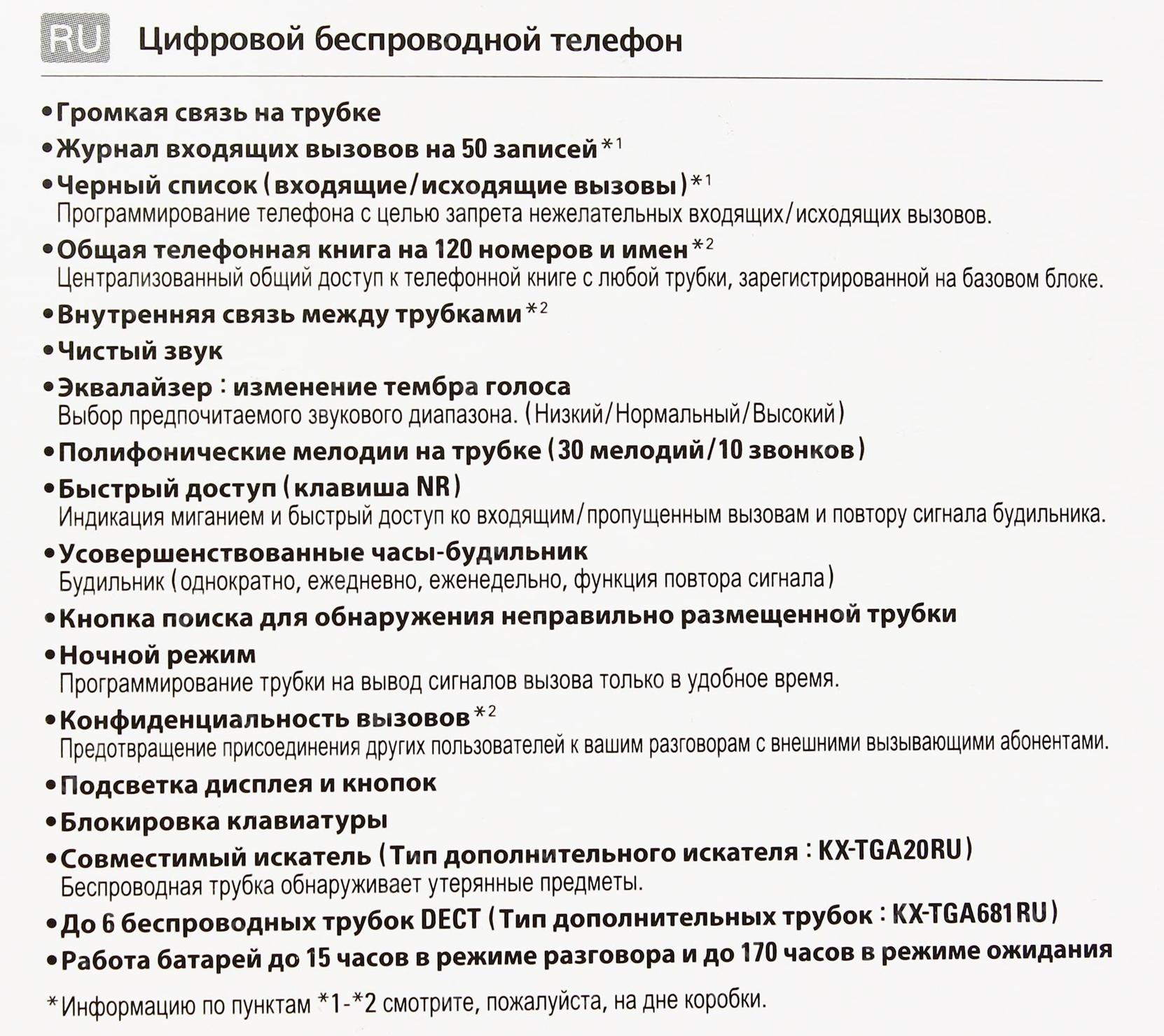 Возможна регистрация на базе до 6 трубок; каждая трубка может быть зарегистрирована не более чем на 4 базах