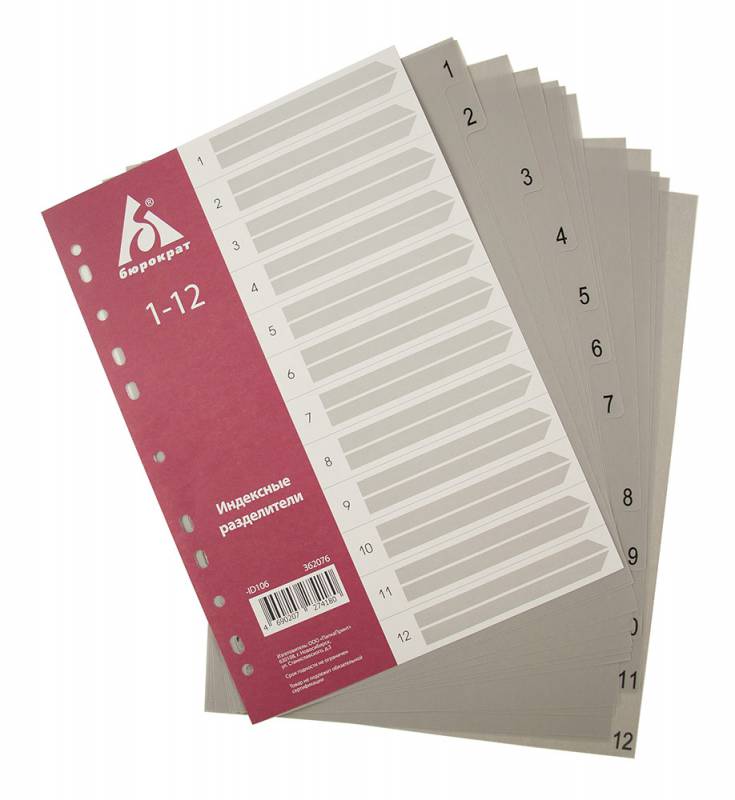 Разделитель индексный Бюрократ ID106 A4 пластик 1-12 с бумажным оглавлением серые разделы (продается кратно 10 шт.)