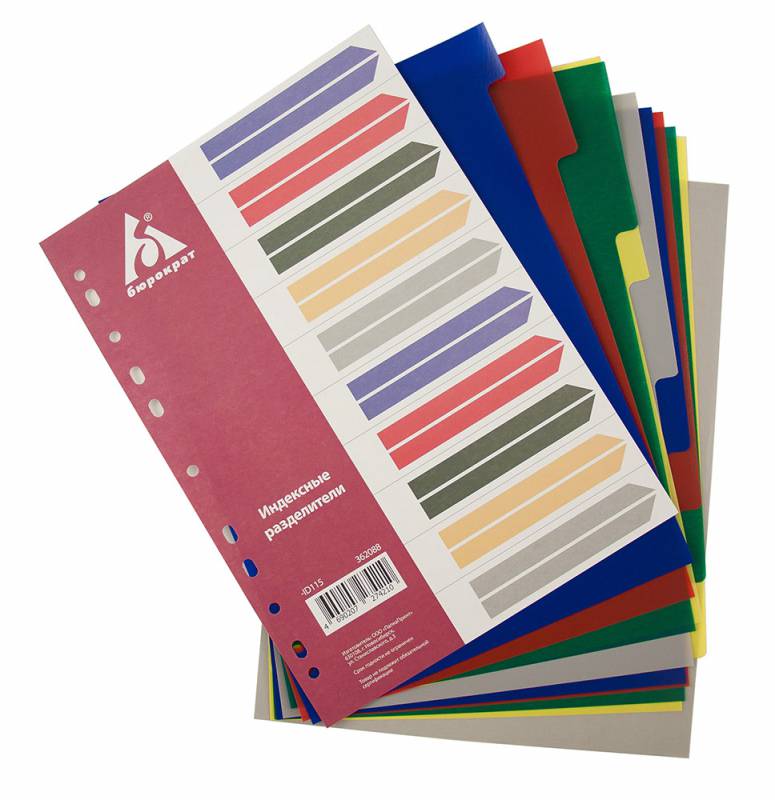 Разделитель индексный Бюрократ ID115 A4 пластик 10 индексов с бумажным оглавлением цветные разделы (продается кратно 10 шт.)