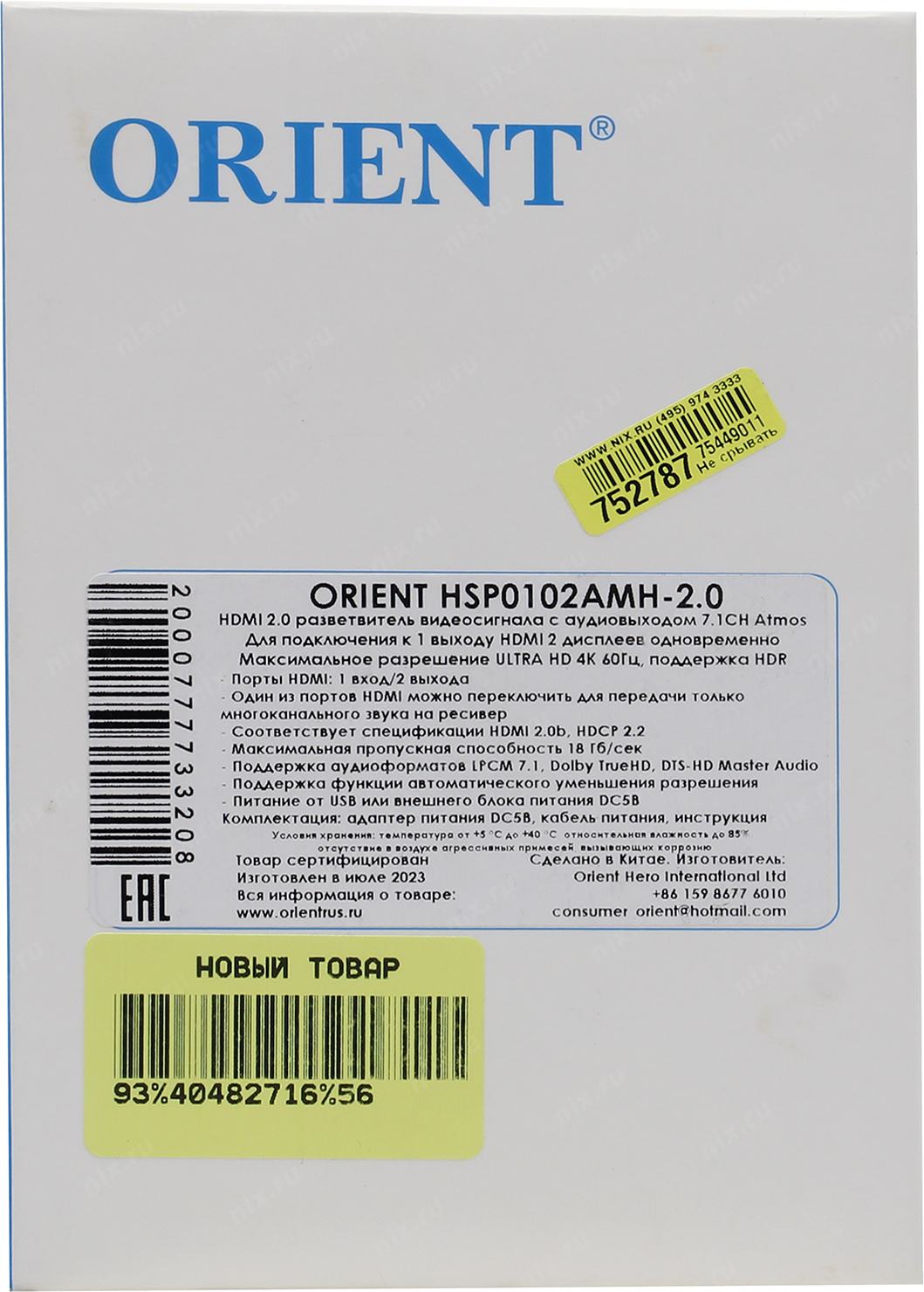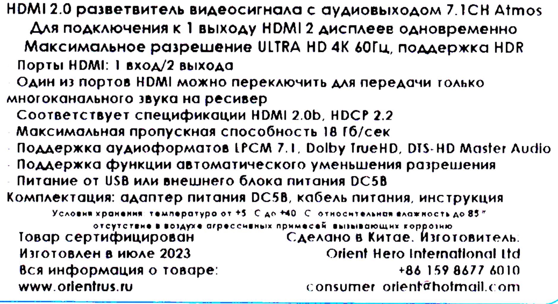 Разветвитель Orient <HSP0102AMH-2.0> HDMI Splitter (1in -> 2out, 2.0)