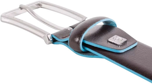 Стильный кожаный мужской ремень Piquadro из популярной коллекции Blu Square. Выполнен из гладкой телячьей кожи с фирменным голубым кантом и прострочкой.