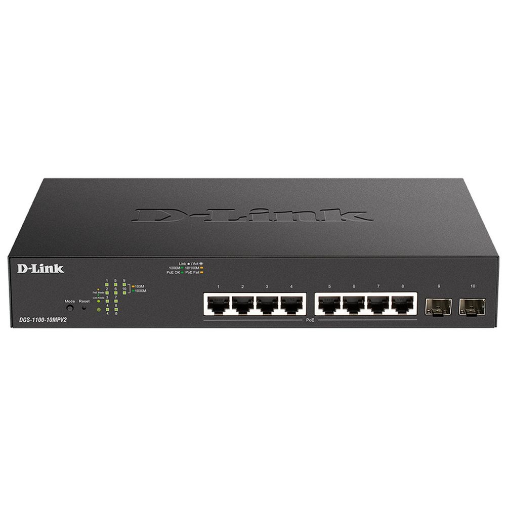 Сетевое оборудование D-Link SMB D-Link DGS-1100-10MPV2/ A3A Настраиваемый L2 коммутатор с 8 портами 10/ 100/ 1000Base-T и 2 портами 1000Base-X SFP (8 портов PoE 802.3af/ at, PoE-бюджет 130 Вт)