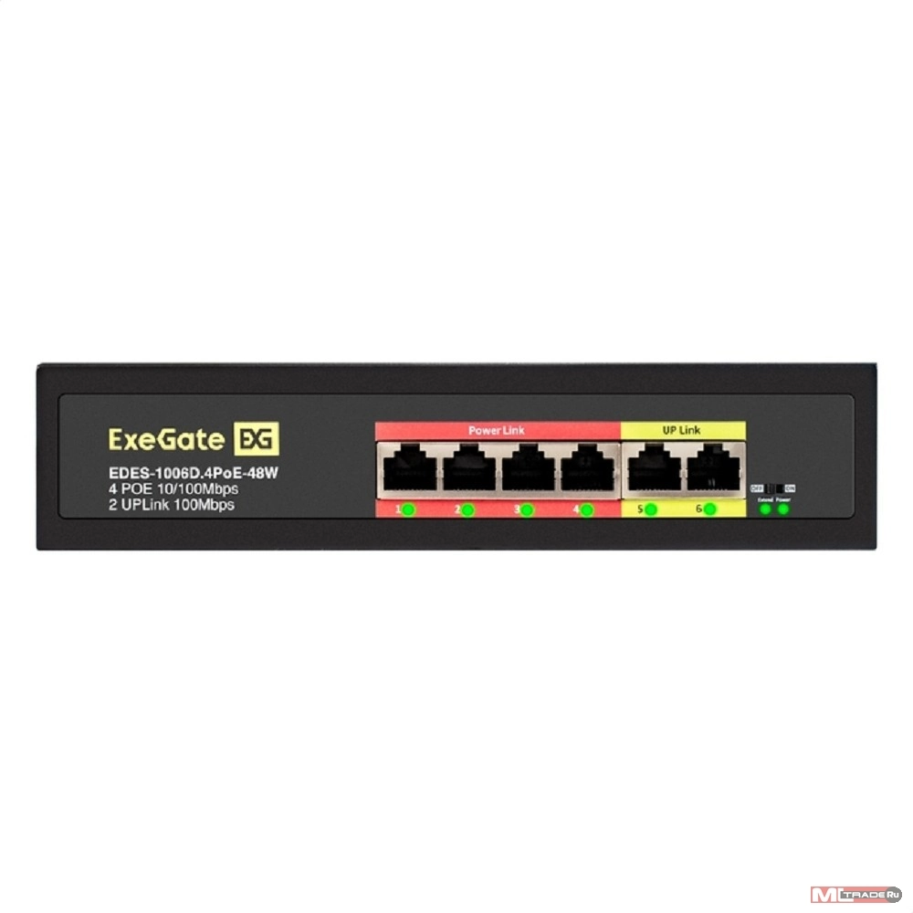 Сетевое оборудование Exegate EX299020RUS Коммутатор неуправляемый ExeGate EDES-1006D.4PoE-48W (6-портовый UTP 10/ 100 Base-Tx: 4 порта 802.3af (PoE) , мощность PoE: 25W, суммарно 48W, 2 порта RJ45 uplink, настенный/ настольн