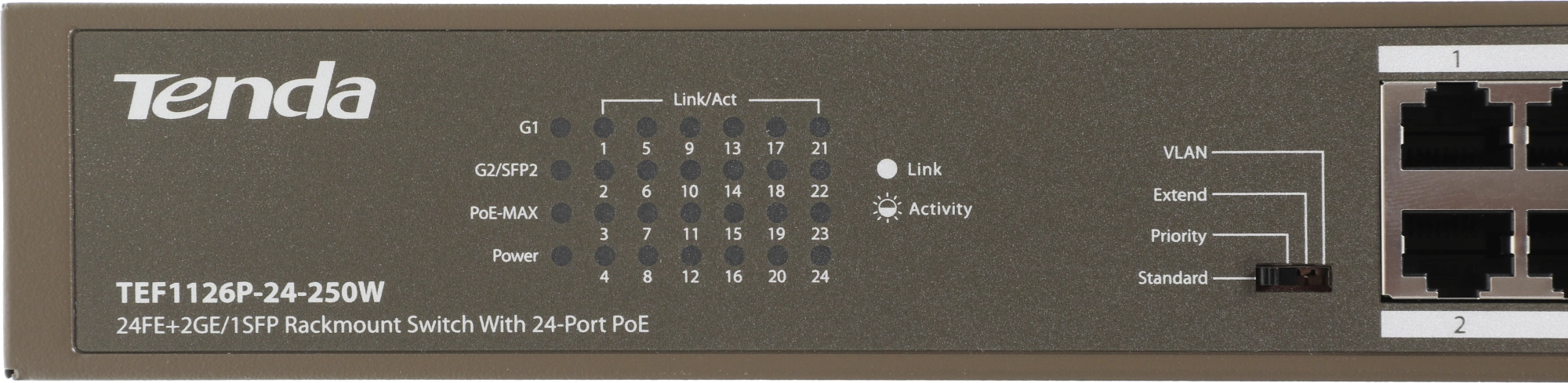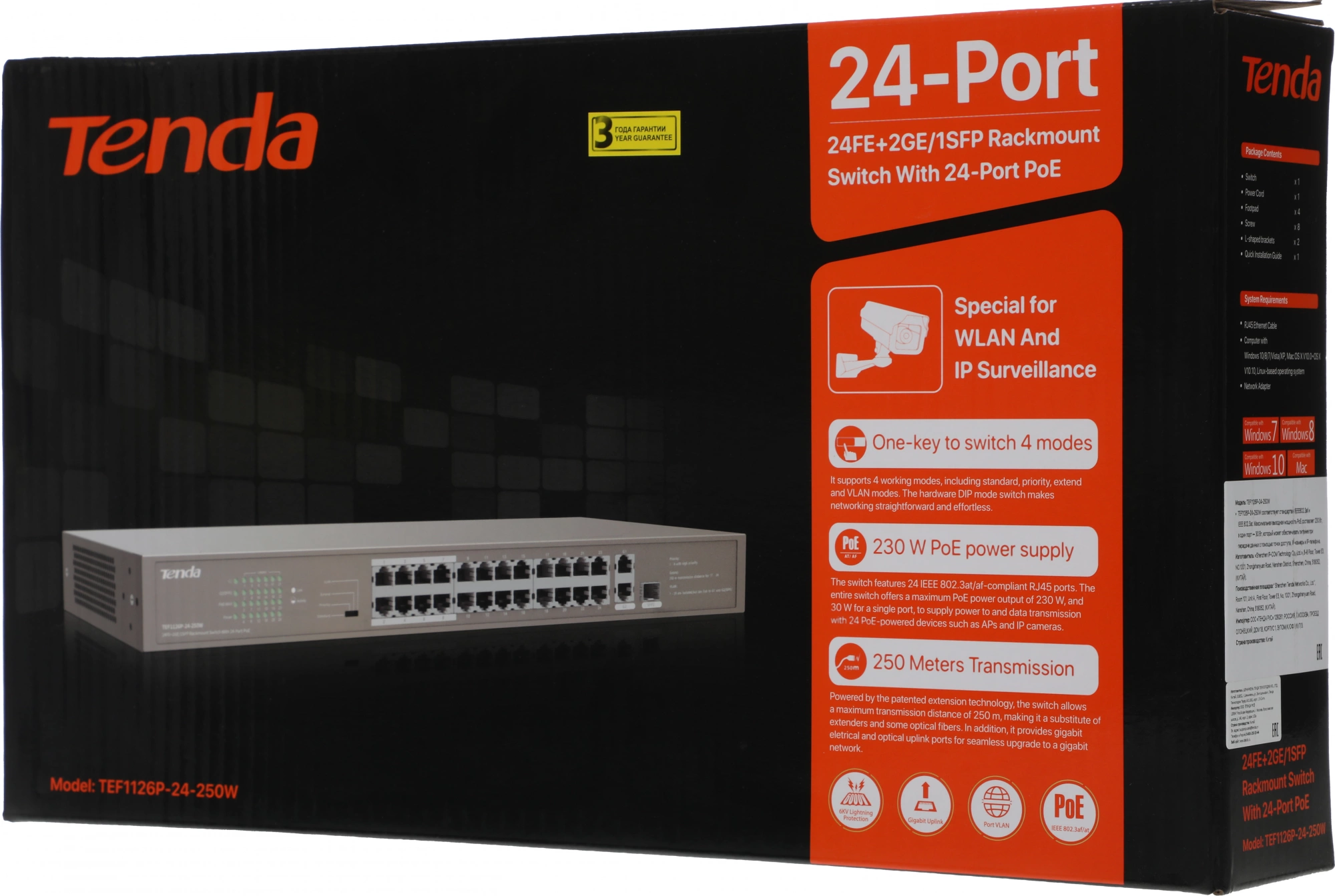Сетевое оборудование TENDA TEF1126P-24-250W Коммутатор в стойку 24-Ports 10/ 100 Base-TX + 2-Ports 10/ 100/ 1000 Base-T + 1-Port 1000 Base-X SFP 24-Ports PoE (PoE бюджет 230W)