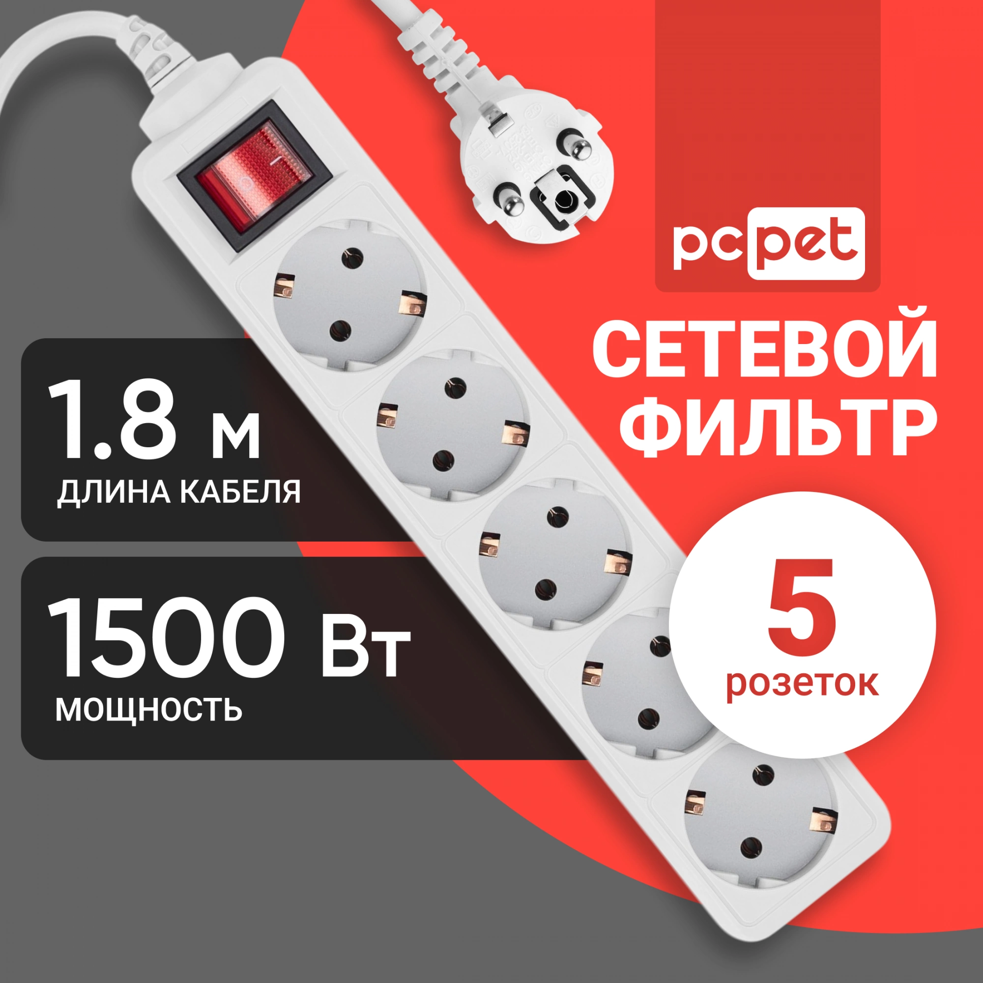Сетевой фильтр PC Pet AP01006-1.8-G 1.8м (5 розеток) серый (пакет ПЭ) (продается кратно 6 шт.)