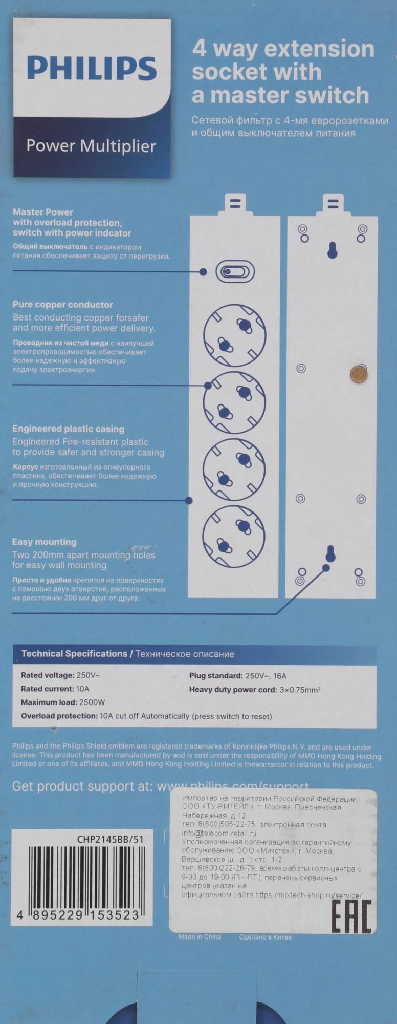 Сетевой фильтр Philips CHP2145BB/ 51 3м (4 розетки) черный (коробка)
