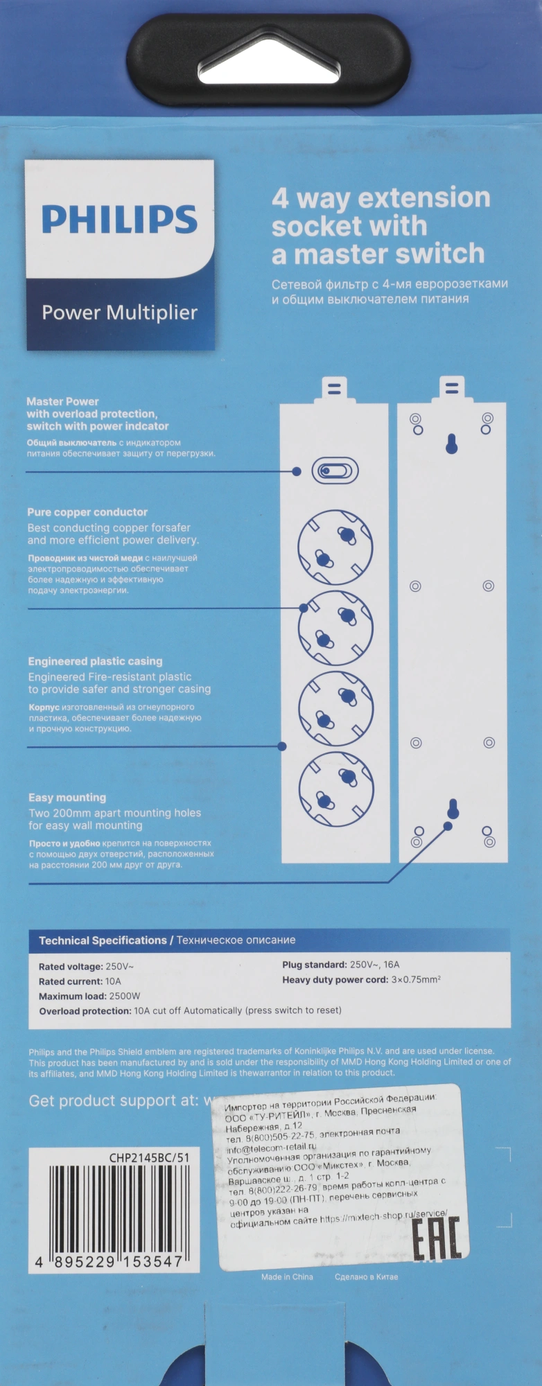 Сетевой фильтр Philips CHP2145BC/ 51 5м (4 розетки) черный (коробка)