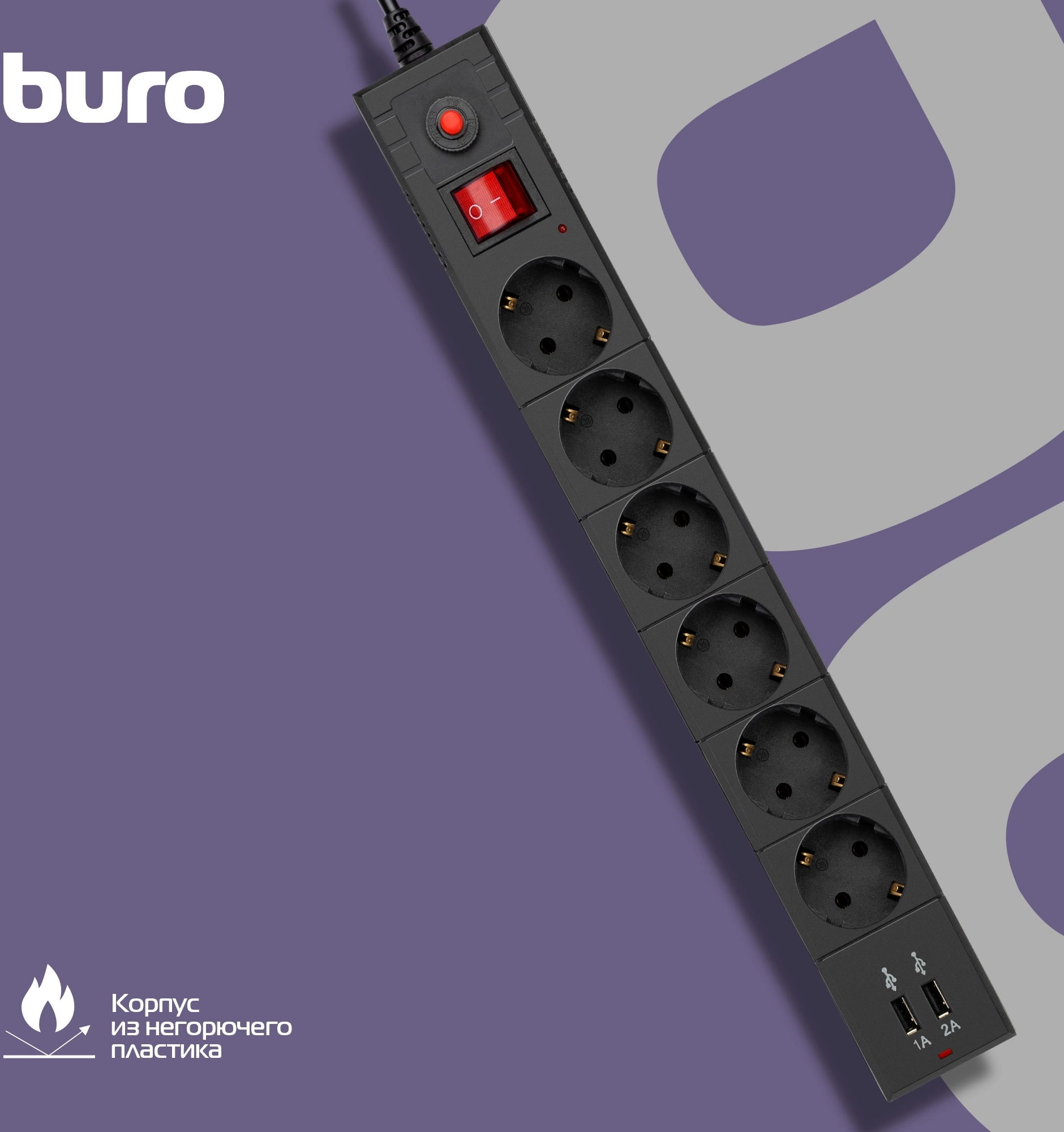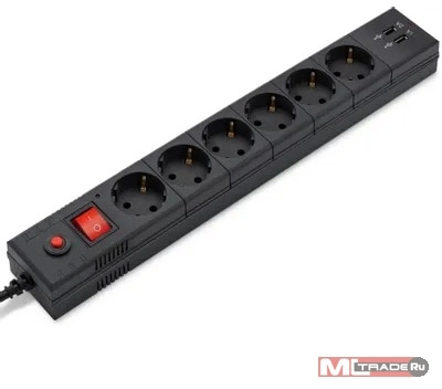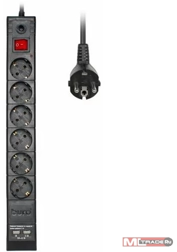 Сетевые фильтры BURO Сетевой фильтр, 6 розеток, 1.8 метров (BURO BU-SP1.8_USB_2A-B), черный (коробка) (992310)