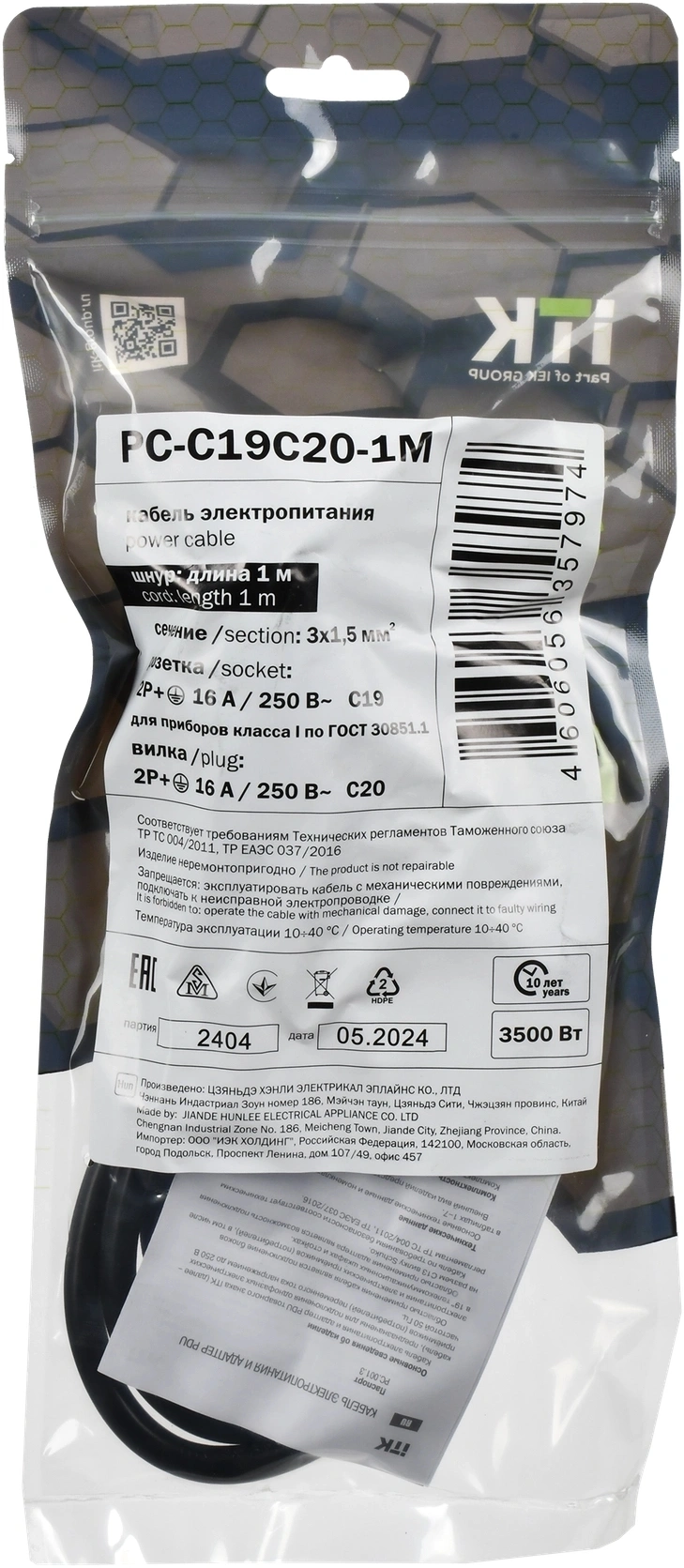 Шнур питания ITK PC-C19C20-1M C19-C20 проводник.:3x1.5мм2 1м 230В 16А черный