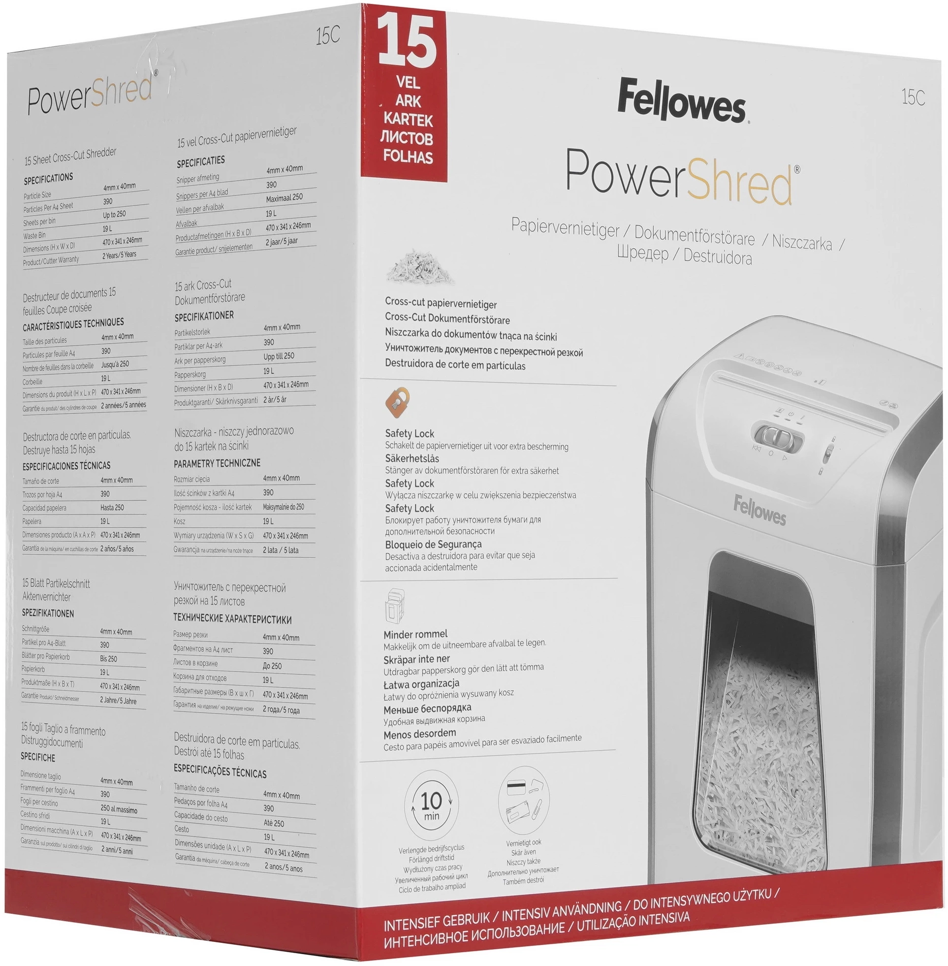 Шредер Fellowes PowerShred 15С белый (секр.P-4) фрагменты 15лист. 19лтр. скрепки скобы пл.карты 100017466