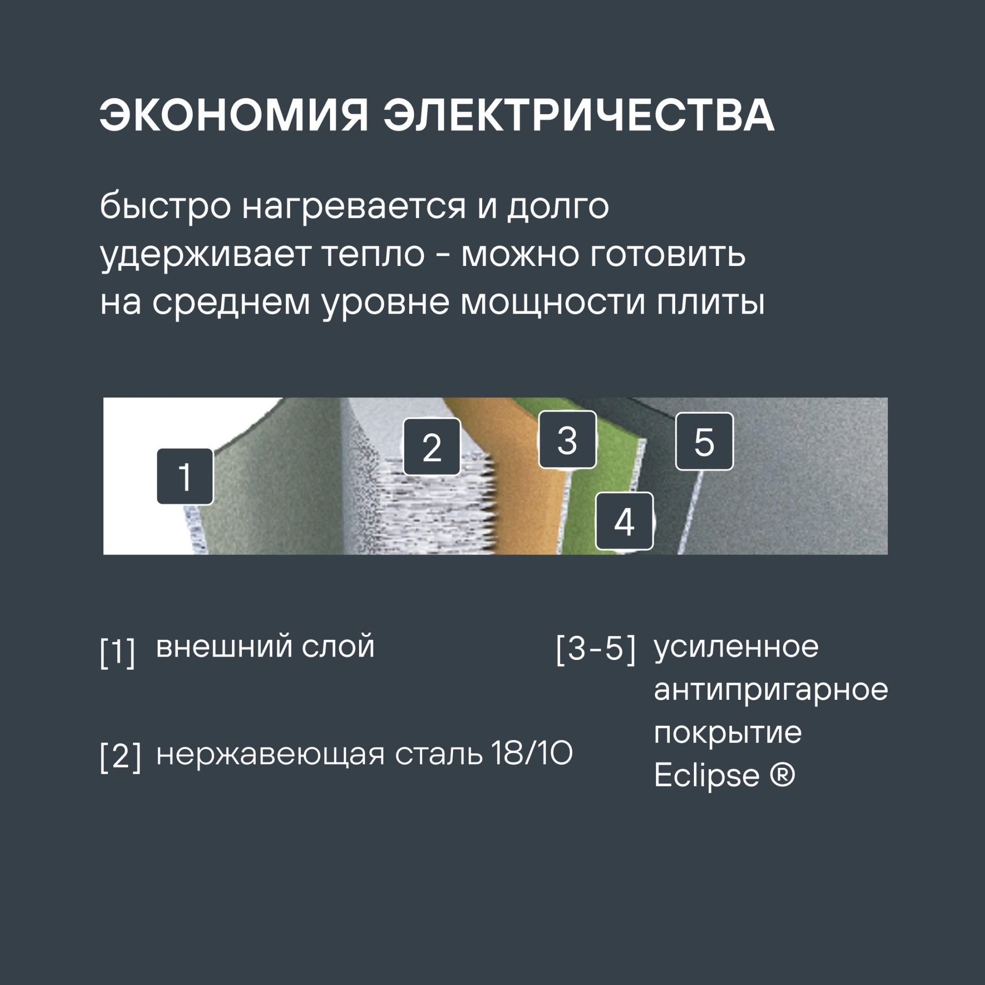 Технология: тройное вштампованное, а затем вплавленное дно без воздушных полостей. Преимущества: комбинированная полировка корпуса; Eclipse® - усиленное трехслойное антипригарное покрытие для интенсивного использования. Упаковка: картонный рукав.