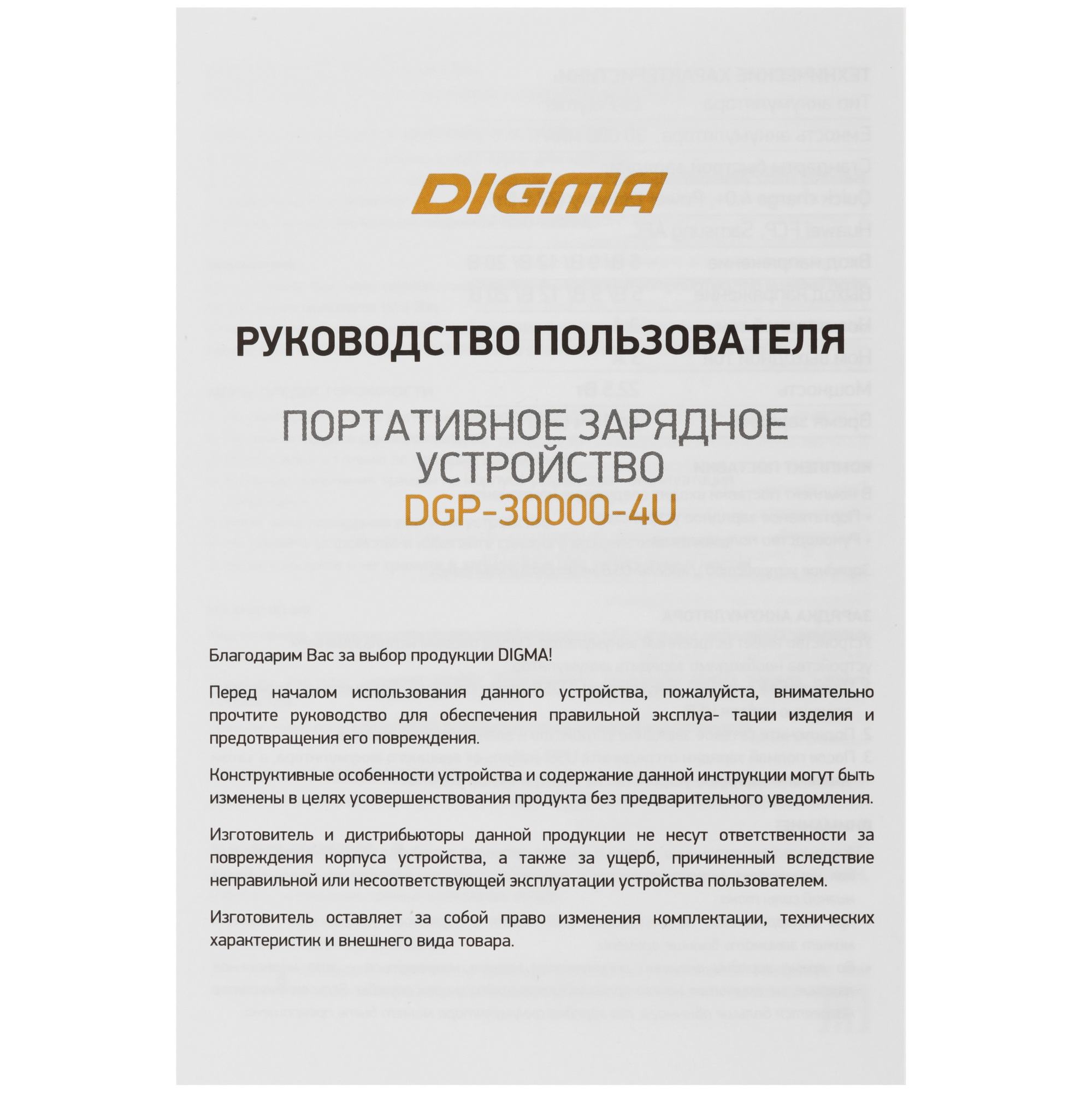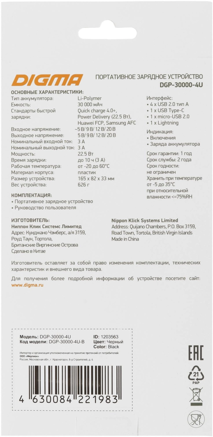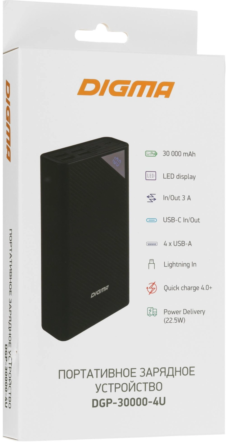 Мобильный аккумулятор Digma DGP-30000-4U 30000mAh QC4.0/PD3.0 22.5W 3A 4xUSB-A/USB-C черный (DGP-30000-4U-B)