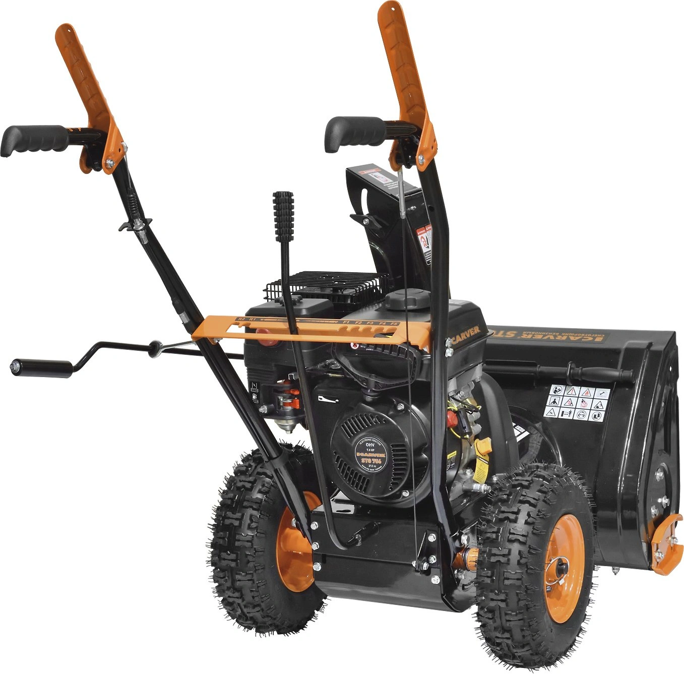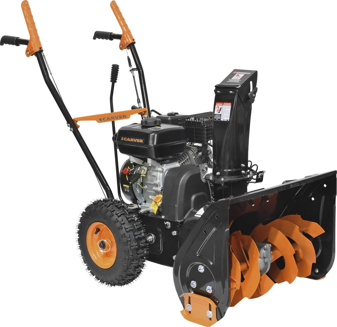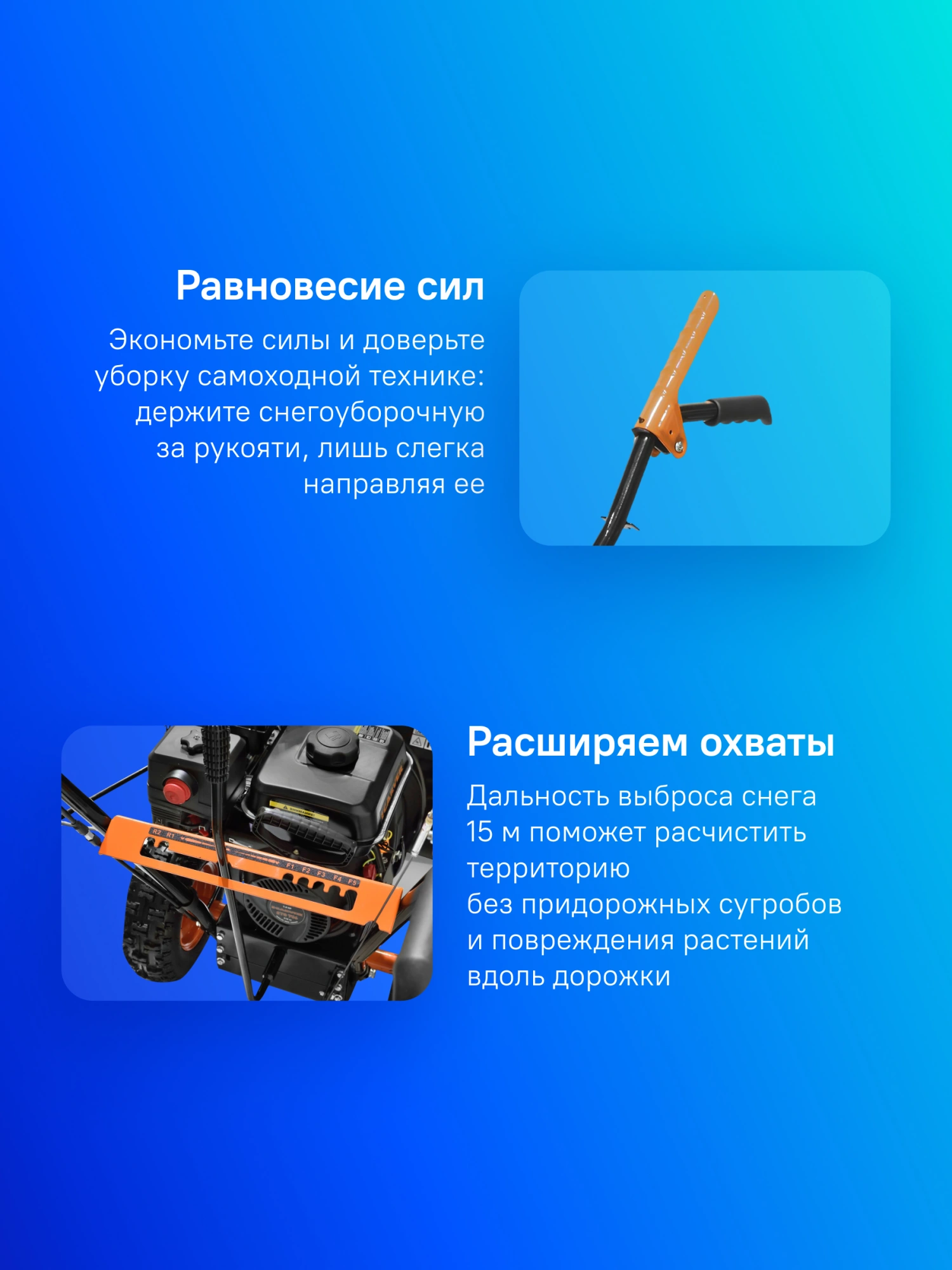 Самоходный снегоуборщик. Собранный снег выбрасывается на расстояние до 15 метров. Этот параметр регулируется, в том числе есть возможность выбрать сторону для сброса снежной массы. Используемая система шнеков – двухступенчатая. Ширина ковша составляет 560 мм.