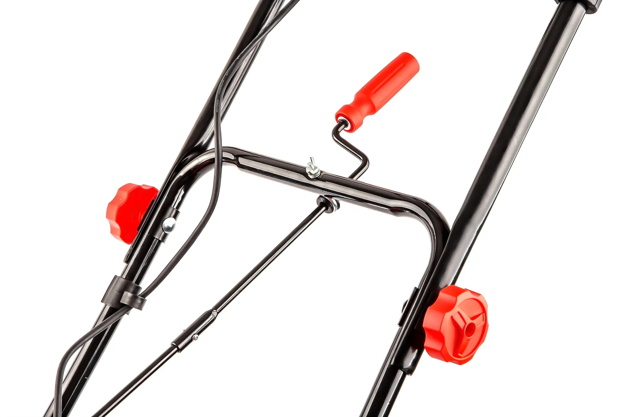 Снегоуборщик перемещается на двух колёсах. Не нужно держать его на весу во время уборки снега. Регулировка угла выброса снега. Направление выброса регулируется в пределах 190°. Для настройки просто поверните рукоятку; Обрезиненный шнек. Обрезиненный шнек не царапает очищаемую поверхность.