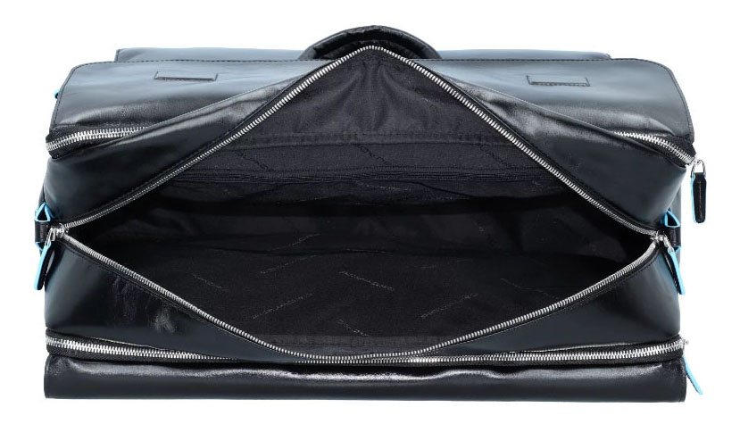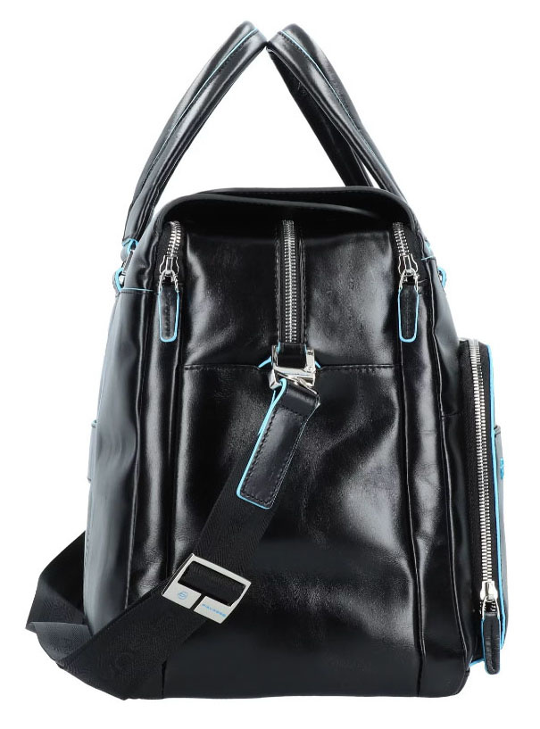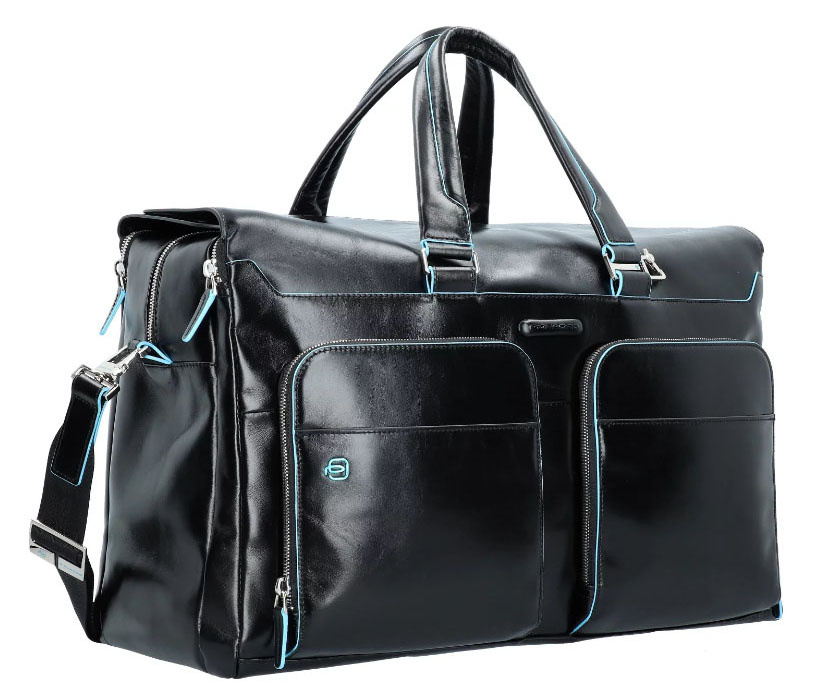 Кожаная дорожная сумка Piquadro из коллекции Blue Square. Сумка изготовлена из мягкой телячьей кожи с восковой пропиткой и фирменным голубым кантом. Имеет одно большое-основное отделение, куда с легкостью поместятся Ваши вещи, а также еще два отделения, одно из которых предназначено для 15 ноутбука