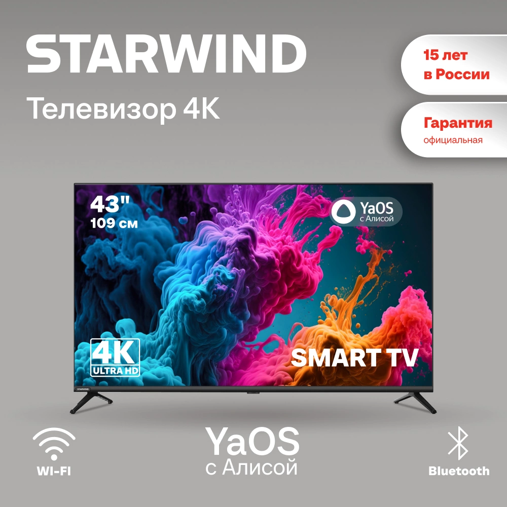 Телевизор LED Starwind 43" SW-LED43UG405 Яндекс.ТВ Frameless черный 4K Ultra HD 60Hz DVB-T DVB-T2 DVB-C DVB-S DVB-S2 USB WiFi Smart TV