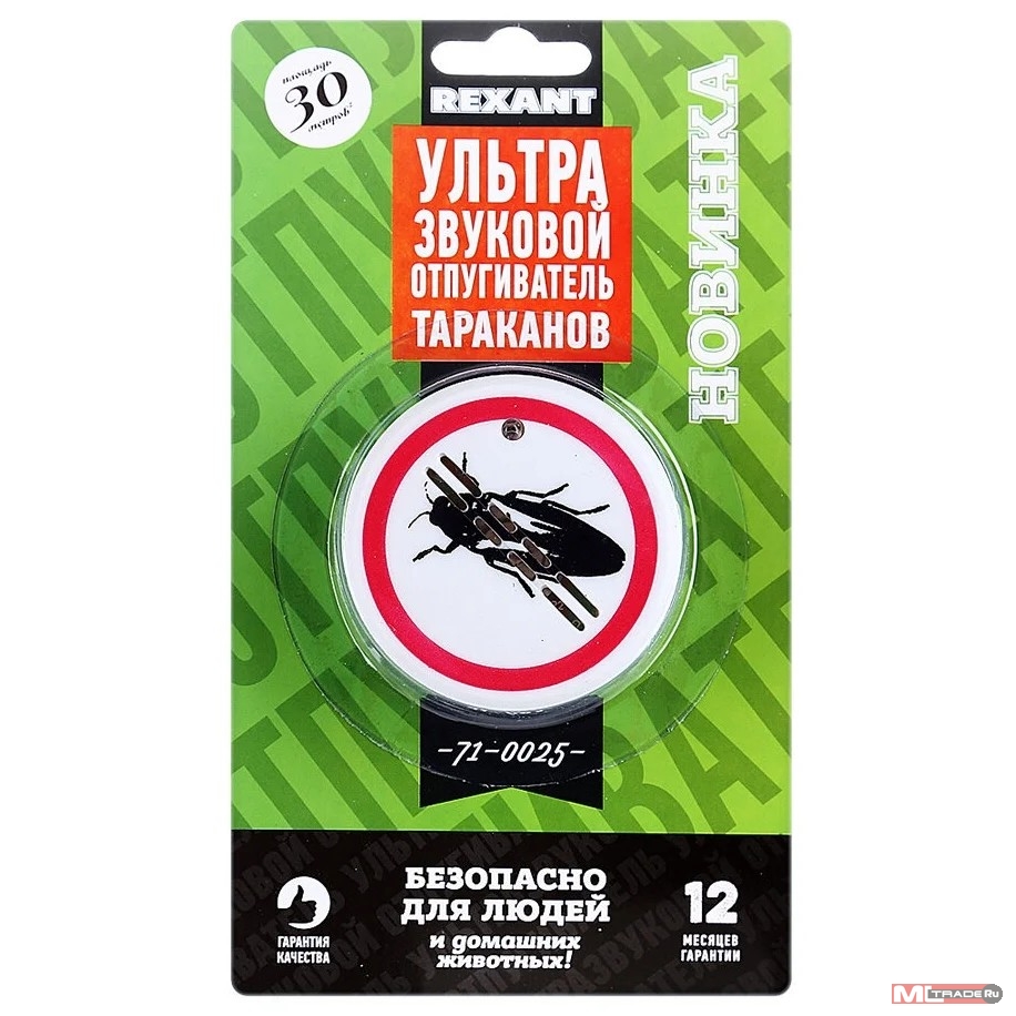 Ультразвуковой отпугиватель тараканов REXANT;;Предназначен для отпугивания тараканов, воздействуя на них путем излучения специальных звуковых волн заставляющих их покинуть помещение.;;Ультразвуковой отпугиватель тараканов является безопасным, компактным, простым в эксплуатации устройством, обеспечивающим надежную защиту помещения от тараканов. Для людей и домашних животных не представляет опасности.;;Площадь действия: 30 м2;;Питание: 220 В;;Частота: 12 кГц;;Потребляемая мощность: 5 Вт;;Материал: пластик ABS;;Размеры: 6*6*6 см;;Вес: 60 гр