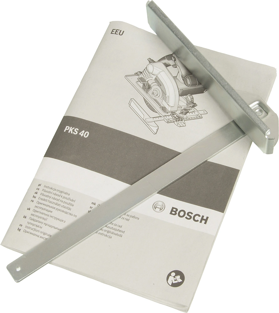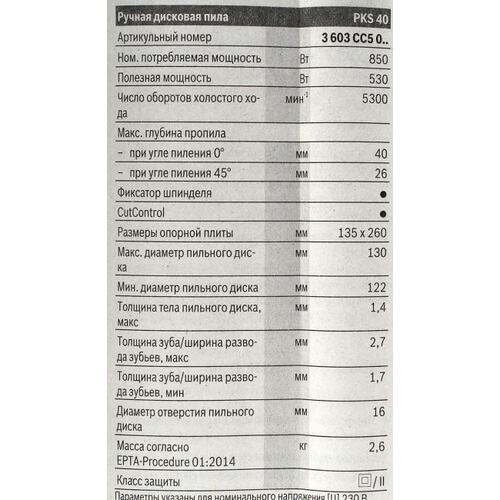 Пила Bosch PKS 40 Ручная дисковая пила [06033C5000] (850 Вт , глубина пропила под углом 90°: 0-40 мм, глубина пропила под углом 45°: 0-26 мм. Направляющая пластина 120 х 260 мм, масса 2,