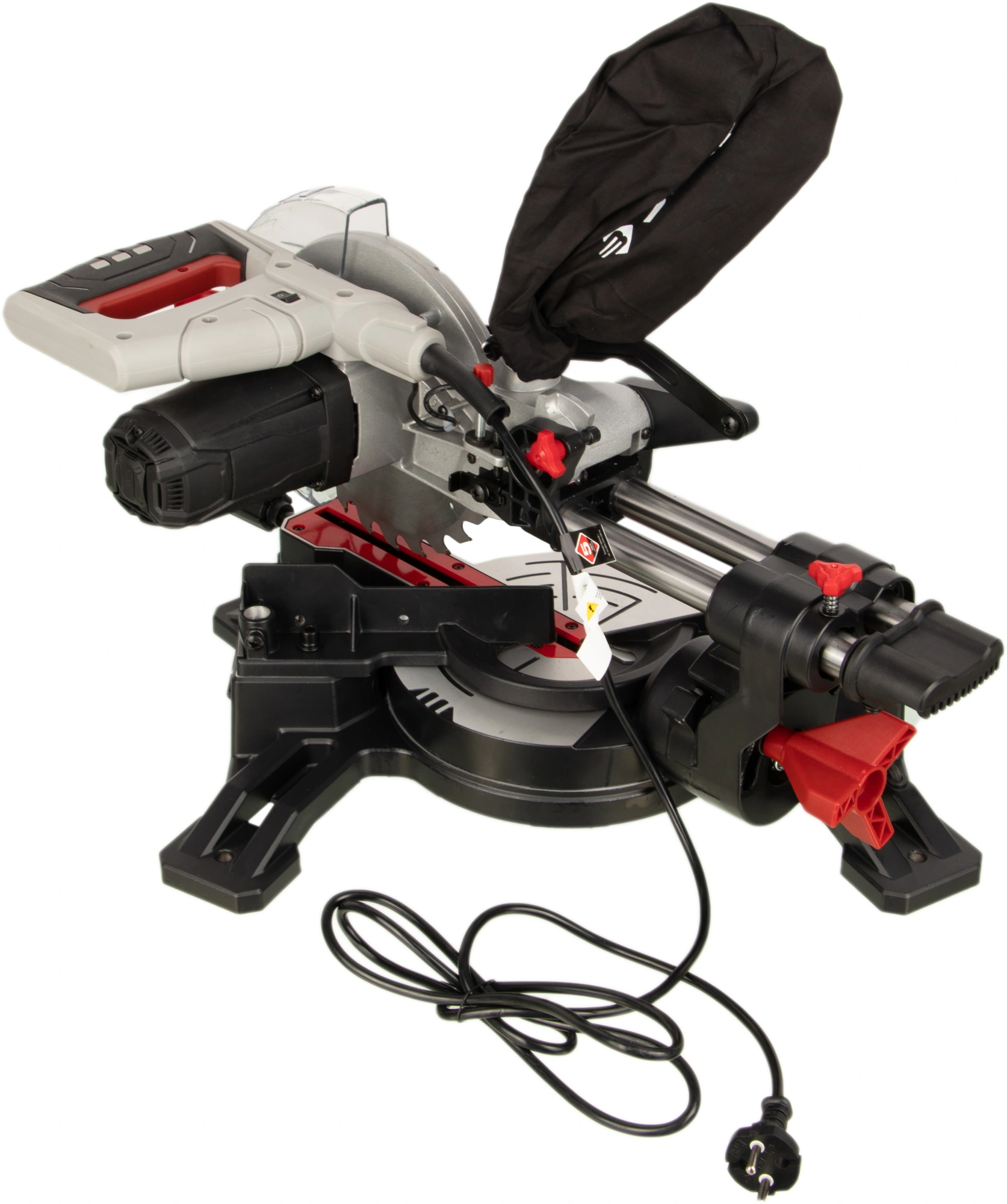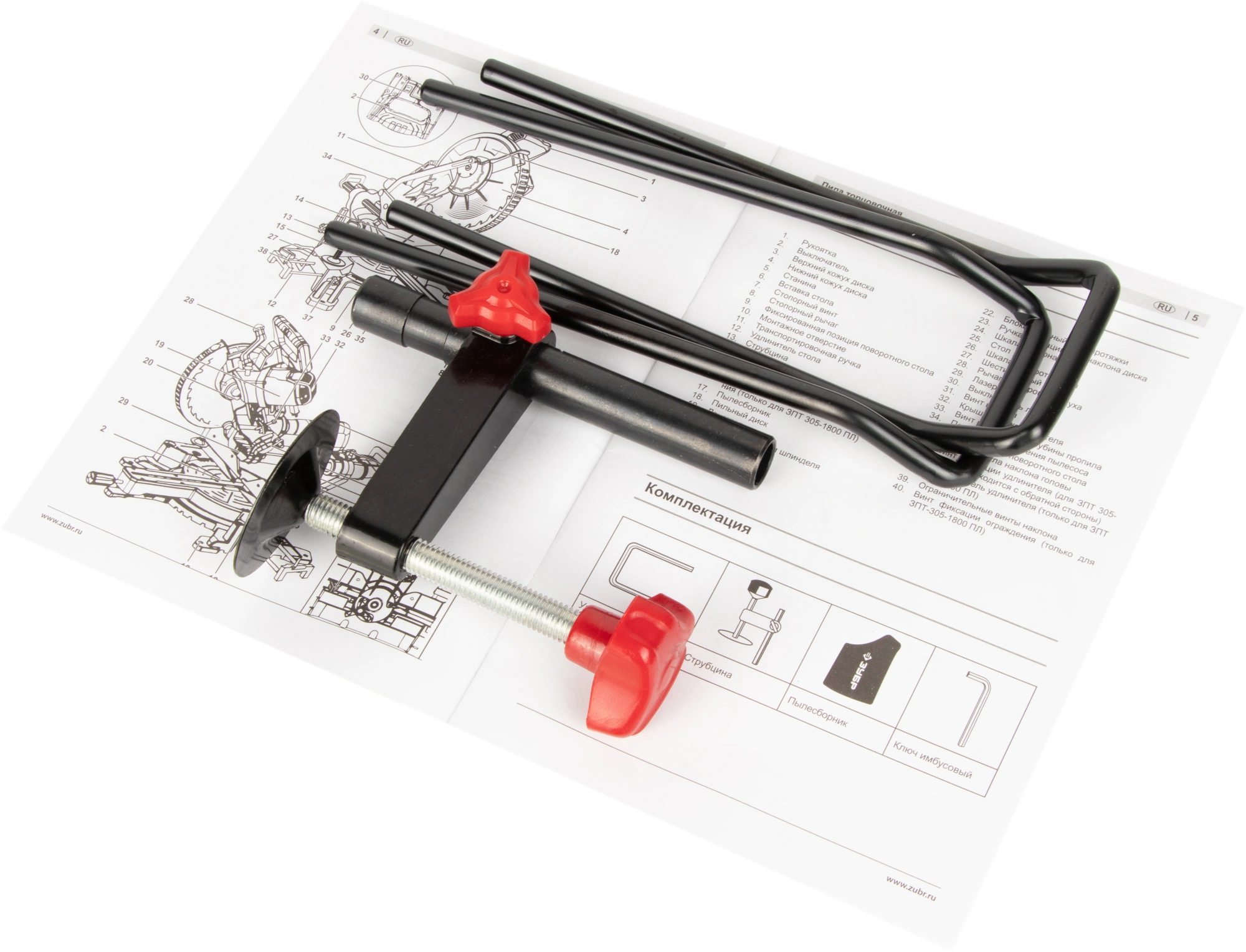Пила, удлинитель стола - 2 шт., имбусовый ключ, струбцина, мешок для сбора пыли, руководство по эксплуатации, коробка.