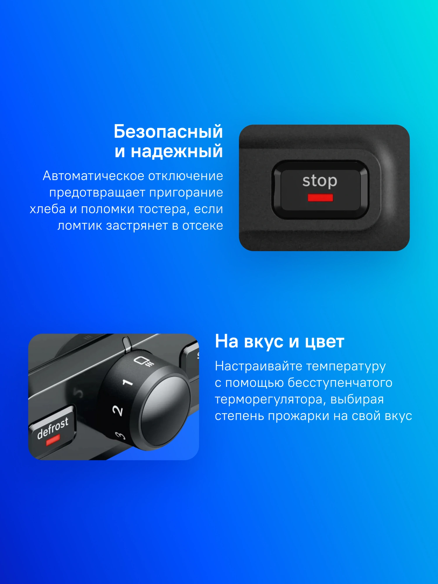 Отдельная подсвеченная клавиша для включения режима приготовления замороженных тостов. Подсвеченная клавиша Stop. Электронный сенсор для поддержания оптимальной температуры поджаривания.