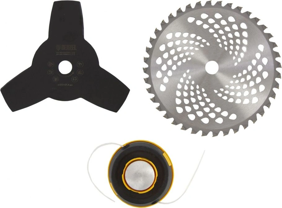 Триммер бензиновый, катушка, нож трехлопастной 3Т, пильный диск 40Т, двухплечевая подвесная система с защитой бедра, дозатор для приготовления смеси, набор крепежа, набор инструментов, руководство по эксплуатации с гарантийным талоном.