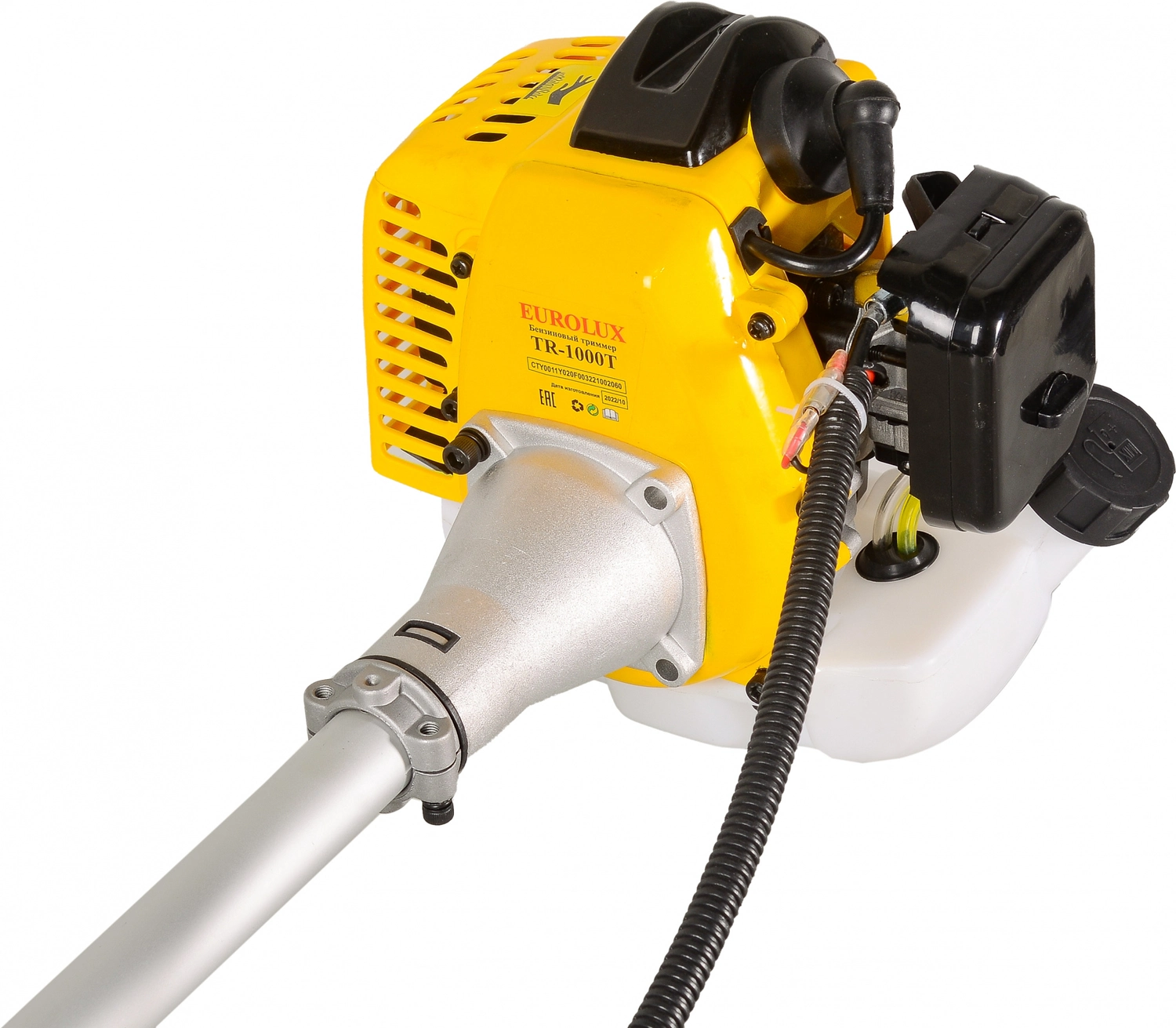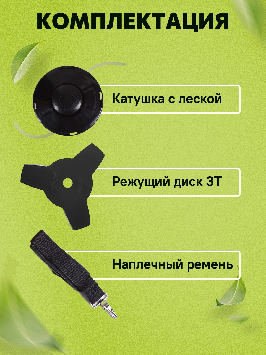 Двигатель в сборе, штанга, защитный кожух, режущий диск, катушка с леской, рукоятки управления (левая и правая) , наплечный ремень, комплект ключей, паспорт продукции.