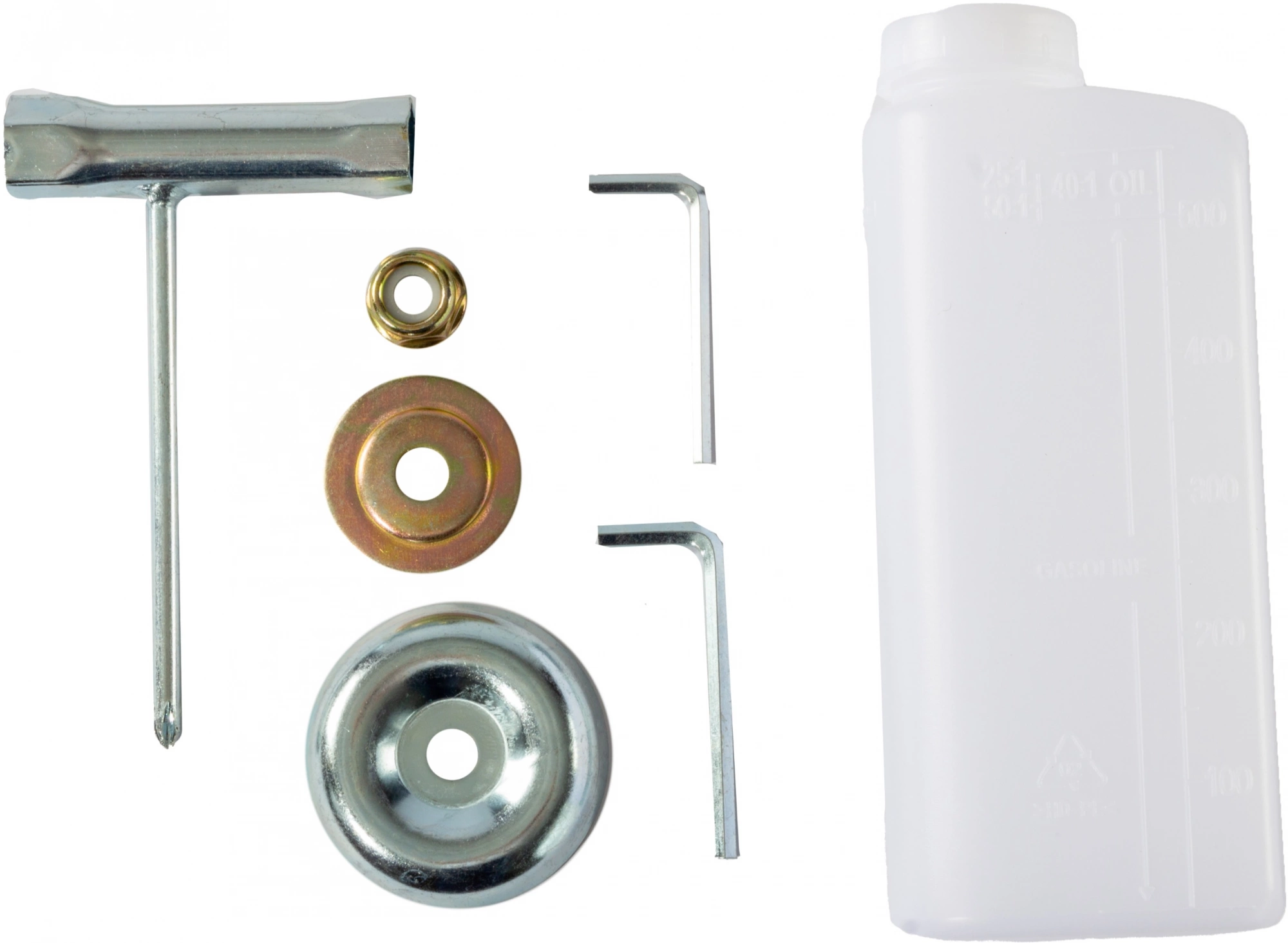 Триммер бензиновый, Защитный щиток, Наплечный ремень, Шпулька с леской, Пильный диск 40 зубьев, Ёмкость для приготовления топливной смеси, Шестигранный ключ - 2шт., Пластиковые стяжки - 2шт., Свечной ключ, Инструкция
